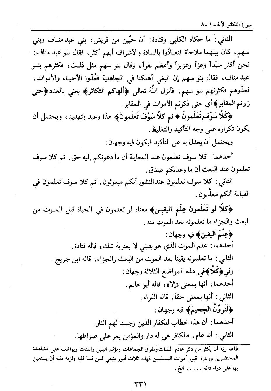 الثاني: ما حكاه الكلبي وقتادة: أن حيّين من قريش , بني عبد مناف وبني سهم , كان بينهما ملاحاة فتعادّوا بالسادة والأشراف أيهم أكثر , فقال بنو عبد مناف: نحن أكثر سيّداً وعزاً وعزيزاً وأعظم نفراً , وقال بنو سهم مثل ذلك , فكثرهم بنو عبد مناف , فقال بنو سهم إن البغي أهلكنا في الجاهلية فعُدّوا الأحياء والأموات , فعدّوهم فكثرتهم بنو سهم , فأنزل الله تعالى {ألهاكم التكاثر} يعني بالعدد {حتى زرتم المقابر} أي حتى ذكرتم الأموات في المقابر. {كَلاَّ سَوْفَ تَعْلَمونَ ثم كلاّ سَوْفَ تَعلَمونَ} هذا وعيد وتهديد , ويحتمل أن يكون تكراره على وجه التأكيد والتغليظ. ويحتمل أن يعدل به عن التأكيد فيكون فيه وجهان: أحدهما: كلا سوف تعلمون عند المعاينة أن ما دعوتكم إليه حق , ثم كلا سوف تعلمون عند البعث أن ما وعدتكم صدق. الثاني: كلا سوف تعلمون عند النشور أنكم مبعوثون , ثم كلا سوف تعلمون في القيامة أنكم معذَّبون. {كلاّ لو تَعْلَمون عِلْمَ اليَقِين} معناه لو تعلمون في الحياة قبل الموت من البعث والجزاء ما تعلمونه بعد الموت منه. {عِلْمَ اليقين} فيه وجهان: أحدهما: علم الموت الذي هو يقيني لا يعتريه شك , قاله قتادة. الثاني: ما تعلمونه يقيناً بعد الموت من البعث والجزاء , قاله ابن جريج. وفي {كَلاَّ} في هذه المواضع الثلاثة وجهان: أحدهما: أنها بمعنى (إلا) , قاله أبو حاتم. الثاني: أنها بمعنى حقاً , قاله الفراء. {لَتَروُنَّ الجَحيمَ} فيه وجهان: أحدهما: أن هذا خطاب للكفار الذين وجبت لهم النار. الثاني: أنه عام , فالكافر هي له دار والمؤمن يمر على صراطها.