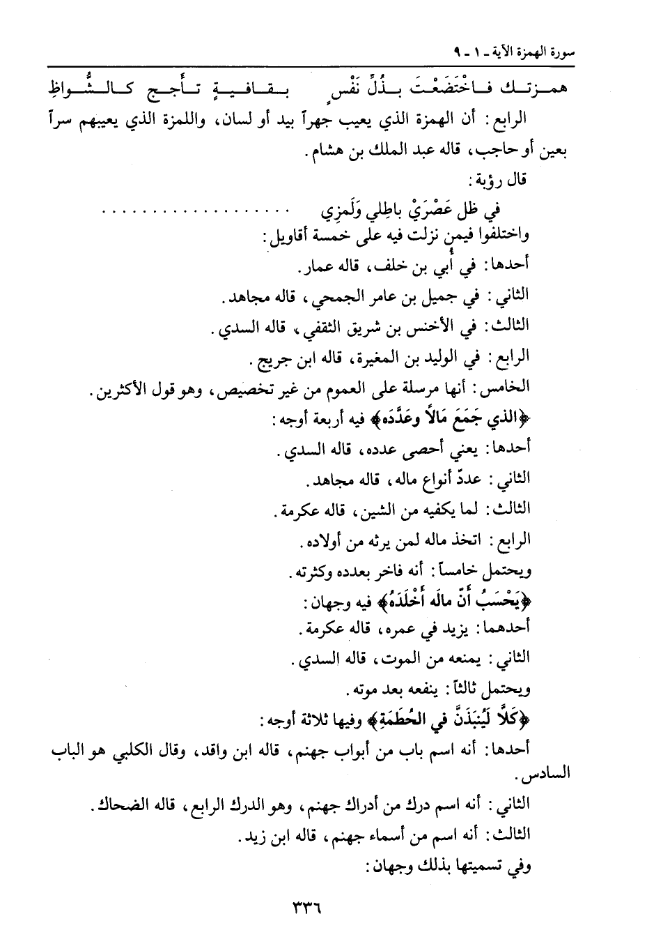 واختلفوا فيمن نزلت فيه على خمسة أقاويل: أحدها: في أُبي بن خلف , قاله عمار. الثاني: في جميل بن عامر الجمحي , قاله مجاهد. الثالث: في الأخنس بن شريق الثقفي , قاله السدي. الرابع: في الوليد بن المغيرة , قاله ابن جريج. الخامس: أنها مرسلة على العموم من غير تخصيص , وهو قول الأكثرين. {الذي جَمَعَ مَالاً وعَدَّدَه} فيه اربعة أوجه: أحدها: يعني أحصى عدده , قاله السدي. الثاني: عددّ أنواع ماله , قاله مجاهد. الثالث: لما يكفيه من الشين , قاله عكرمة. الرابع: اتخذ ماله لمن يرثه من أولاده. ويحتمل خامساً: أنه فاخر بعدده وكثرته. {يَحْسَبُ أَنّ مالَه أَخْلَدَهُ} فيه وجهان: أحدهما: يزيد في عمره , قال عكرمة. الثاني: يمنعه من الموت , قال السدي. ويحتمل ثالثاً: ينفعه بعد موته. {كَلاَّ لَيُنبَذَنَّ في الحُطَمَةِ} وفيها ثلاثة أوجه: أحدها: أنه اسم باب من أبواب جهنم , قاله ابن واقد , وقال الكلبي هو الباب السادس. الثاني: أنه اسم درك من أدراك جهنم , وهو الدرك الرابع , قاله الضحاك. الثالث: أنه اسم من أسماء جهنم , قاله ابن زيد. وفي تسميتها بذلك وجهان: