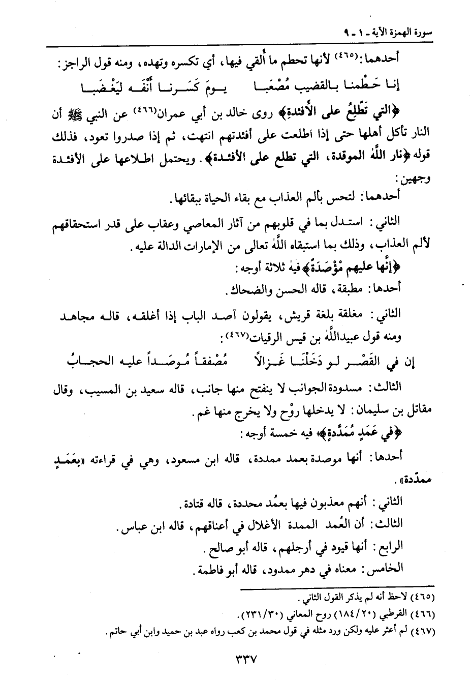 الثالث: مسدودة الجوانب لا ينفتح منها جانب , قاله سعيد بن المسيب , وقال مقاتل بن سليمان: لا يدخلها روْح ولا يخرج منها غم. {في عَمَدٍ مُمَدَّدةٍ} فيه خمسة أوجه: أحدها: أنها موصدة بعمد ممددة , قاله ابن مسعود , وهي في قراءته (بعَمَدٍ ممدّدة). الثاني: أنهم معذبون فيها بعُمد محددة , قاله قتادة. الثالث: أن العُمد الممدة الأغلال في أعناقهم , قاله ابن عباس. الرابع: أنها قيود في أرجلهم , قاله أبو صالح. الخامس: معناه في دهر ممدود , قاله أبو فاطمة.