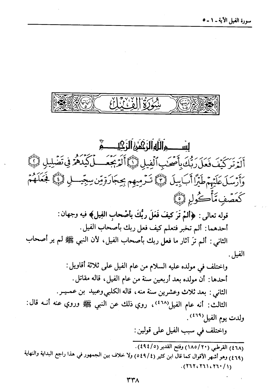 {ألم تر كيف فعل ربك بأصحاب الفيل ألم يجعل كيدهم في تضليل وأرسل عليهم طيرا أبابيل ترميهم بحجارة من سجيل فجعلهم كعصف مأكول} قوله تعالى: {ألمْ تَرَ كيفَ فَعَلَ ربُّكَ بأصْحابِ الفِيل} فيه وجهان: أحدهما: ألم تخبر فتعلم كيف فعل ربك بأصحاب الفيل. الثاني: ألم ترَ آثار ما فعل ربك بأصحاب الفيل , لأن النبي صلى الله عليه وسلم لم ير أصحاب الفيل. واختلف في مولده عليه السلام من عام الفيل على ثلاثة أقاويل: أحدها: أن مولده بعد أربعين سنة من عام الفيل , قاله مقاتل: الثاني: بعد ثلاث وعشرين سنة منه , قاله الكلبي وعبيد بن عمير. الثالث: أنه عام الفيل , روي ذلك عن النبي صلى الله عليه وسلم وروي عنه أنه قال: ولدت يوم الفيل. واختلف في سبب الفيل على قولين: