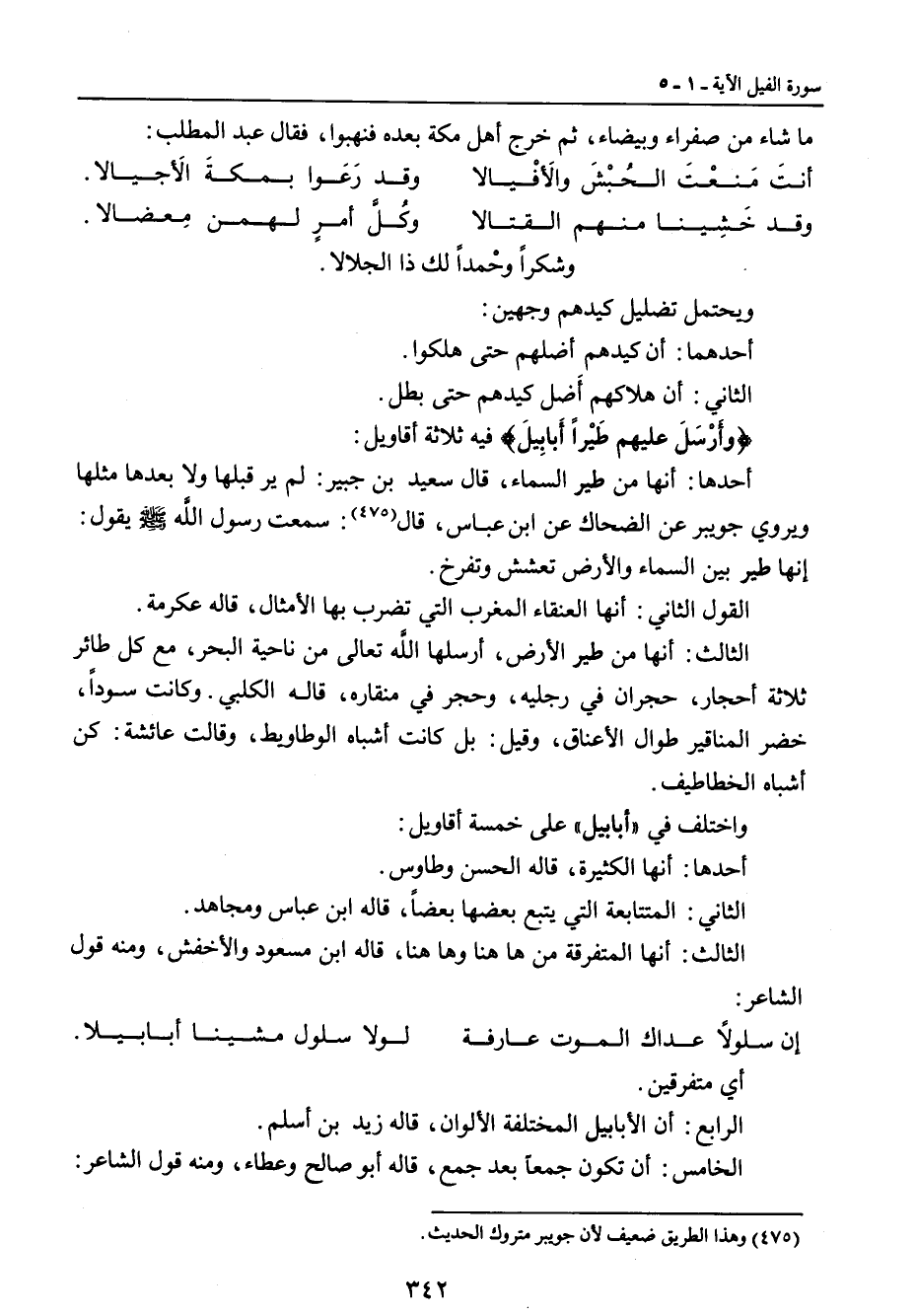 ويحتمل تضليل كيدهم وجهين: أحدهما: أن كيدهم أضلهم حتى هلكوا. الثاني: أن هلاكهم أضل كيدهم حتى بطل. {وأرْسَلَ عليهم طَيْراً أَبابِيلَ} فيه ثلاثة أقاويل: أحدها: أنها من طير السماء , قاله سعيد بن جبير: لم ير قبلها ولا بعدها مثلها ويروي جويبر عن الضحاك عن ابن عباس , قال: سمعت رسول الله صلى الله عليه وسلم يقول: (إنها طير بين السماء والأرض تعشعش وتفرخ). القول الثاني: أنها العنقاء المغرب التي تضرب بها الأمثال , قاله عكرمة. الثالث: أنها من طير الأرض , أرسلها الله تعالى من ناحية البحر , مع كل طائر ثلاثة أحجار , حجران في رجليه , وحجر في منقاره , قاله الكلبي , وكانت سوداً , خضر المناقير طوال الأعناق , وقيل: بل كانت أشباه الوطاويط , وقالت عائشة: كن أشباه الخطاطيف. واختلف في (أبابيل) على خمسة أقاويل: أحدها: أنها الكثيرة , قاله الحسن وطاوس. الثاني: المتتابعة التي يتبع بعضها بعضاً , قاله ابن عباس ومجاهد. الثالث: أنها المتفرقة من ها هنا وها هنا , قاله ابن مسعود والأخفش , ومنه قول الشاعر: