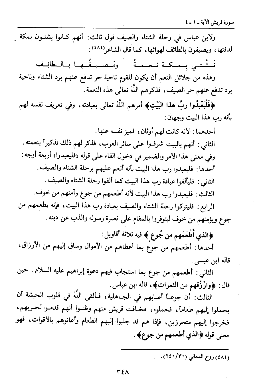 وهذه من جلائل النعم أن يكون للقوم ناحية حر تدفع عنهم برد الشتاء وناحية برد تدفع عنهم حر الصيف، فذكرهم الله تعالى هذه النعمة. {فَلْيَعْبدوا ربَّ هذا البَيْتِ} أمرهم الله تعالى بعبادته، وفي تعريف نفسه لهم بأنه رب هذا البيت وجهان: أحدهما: لأنه كانت لهم أوثان، فميز نفسه عنها. الثاني: أنهم بالبيت شرفوا على سائر العرب، فذكر لهم ذلك تذكيراً بنعمته. وفي معنى هذا الأمر والضمير في دخول الفاء على قوله (فليعبدوا) أربعة أوجه: أحدها: فليعبدوا رب هذا البيت بأنه أنعم عليهم برحلة الشتاء والصيف. الثاني: فليألفوا عبادة رب هذا البيت كما ألفوا رحلة الشتاء والصيف. الثالث: فليعبدوا رب هذا البيت لأنه أطعمهم من جوع وآمنهم من خوف. الرابع: فليتركوا رحلة الشتاء والصيف بعبادة رب هذا البيت , فإنه يطعمهم من جوع ويؤمنهم من خوف ليتوفروا بالمقام على نصرة رسوله والذب عن دينه. {الذي أطْعَمَهم من جُوعٍ} فيه ثلاثة أقاويل: أحدها: أطعمهم من جوع بما أعطاهم من الأموال وساق إليهم من الأرزاق , قاله ابن عيسى. الثاني: أطعمهم من جوع بما استجاب فيهم دعوة إبراهيم عليه السلام. حين قال: {وارْزُقهم من الثمرات} قاله ابن عباس. الثالث: أن جوعاً أصابهم في الجاهلية , فألقى الله في قلوب الحبشة أن يحملوا إليهم طعاماً , فحملوه، فخافت قريش منهم وظنوا أنهم قدموا لحربهم , فخرجوا إليهم متحرزين , فإذا هم قد جلبوا إليهم الطعام وأعانوهم بالأقوات , فهو معنى قوله {الذي أطعمهم من جوع}.