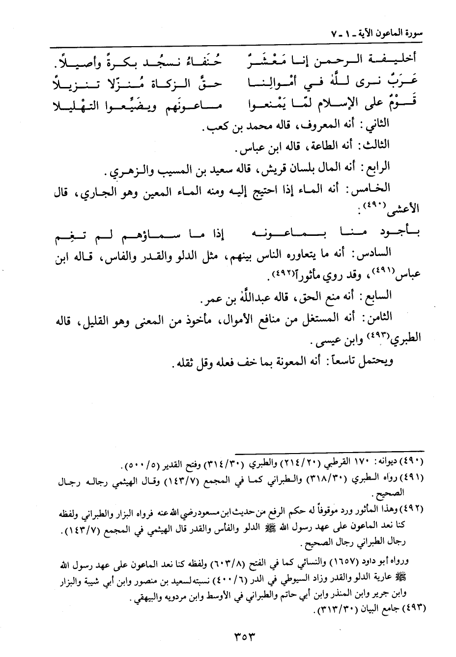 السادس: أنه ما يتعاوره الناس بينهم , مثل الدلو والقدر والفاس , قاله ابن عباس , وقد روي مأثوراً. السابع: أنه منع الحق , قاله عبد الله بن عمر. الثامن: أنه المستغل من منافع الأموال , مأخوذ من المعنى وهو القليل , قاله الطبري وابن عيسى. ويحتمل تاسعاً: أنه المعونة بما خف فعله وقل ثقله.