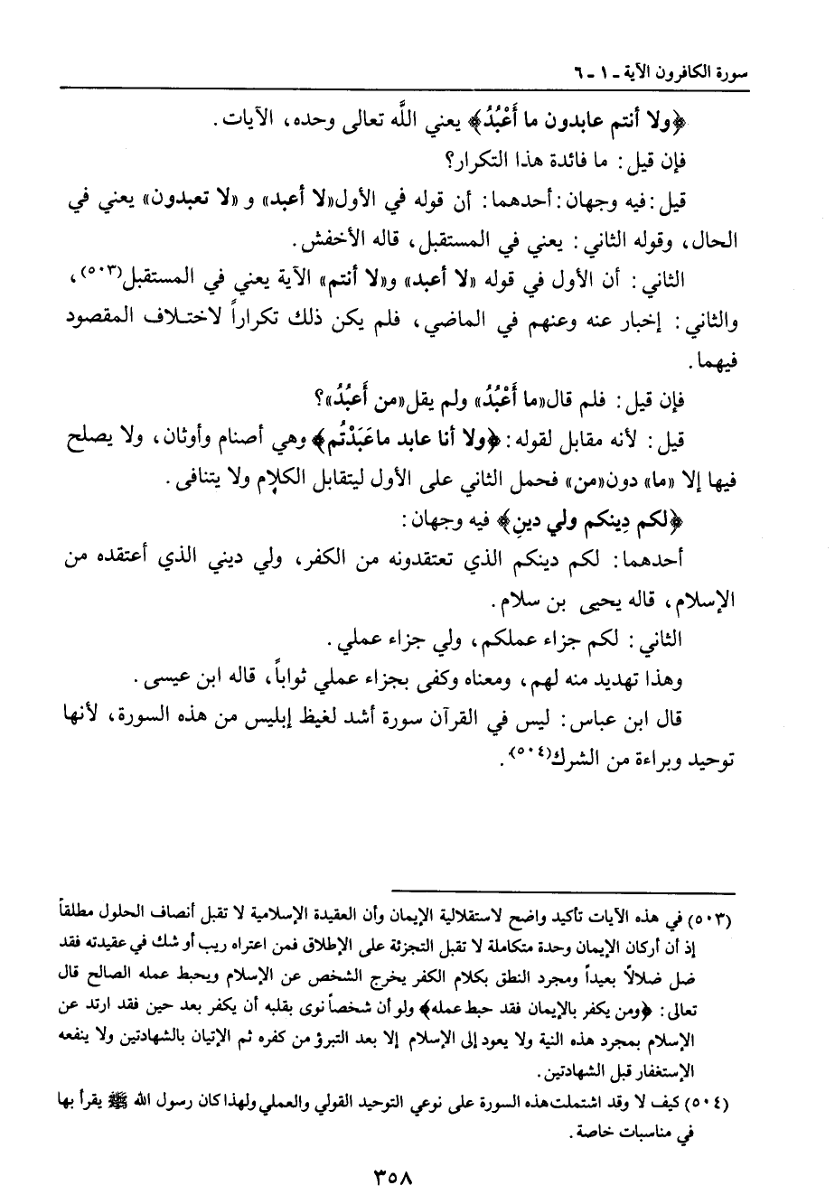 {ولا أنتم عابدون ما أَعْبُدُ} يعني الله تعالى وحده , الآيات. فإن قيل: ما فائدة هذا التكرار؟ قيل: فيه وجهان: أحدهما: أن قوله في الأول (لا أعبد) و (لا تعبدون) يعني في الحال , وقوله الثاني: يعني في المستقبل , قاله الأخفش. الثاني: أن الأول في قوله (لا أعبد) و (لا أنتم) الآية يعني في المستقبل , والثاني: إخبار عنه وعنهم في الماضي , فلم يكن ذلك تكراراً لاختلاف المقصود فيهما. فإن قيل: فلم قال (ما أَعْبُدُ) ولم يقل (من أَعبُدُ)؟ قيل: لأنه مقابل لقوله: {ولا أنا عابد ما عَبَدْتُم} وهي أصنام وأوثان , ولا يصلح فيها إلا (ما) دون (من) فحمل الثاني على الأول ليتقابل الكلام ولا يتنافى. {لكم دِينكم ولي دينِ} فيه وجهان: أحدهما: لكم دينكم الذي تعتقدونه من الكفر , ولي ديني الذي أعتقده من الإسلام , قاله يحيى بن سلام. الثاني: لكم جزاء عملكم , ولي جزاء عملي. وهذا تهديد منه لهم , ومعناه وكفى بجزاء عملي ثواباً , قاله ابن عيسى. قال ابن عباس: ليس في القرآن سورة أشد لغيظ إبليس من هذه السورة , لأنها توحيد وبراءة من الشرك.