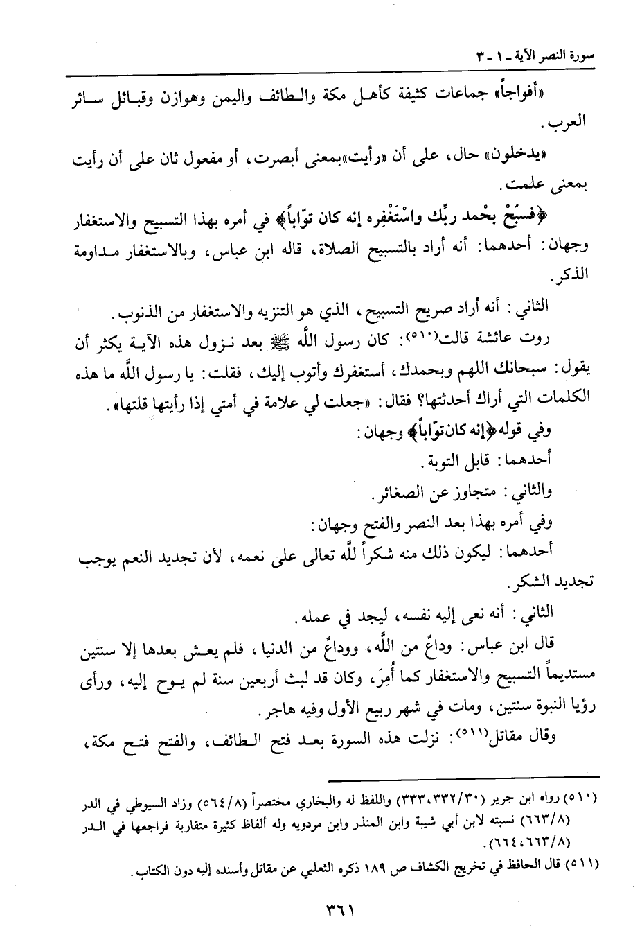 (أفواجاً) جماعات كثيفة كأهل مكة والطائف واليمن وهوازن وقبائل سائر العرب. (يدخلون) حال , على أن (رأيت) بمعنى أبصرت , أو مفعول ثان على أن رأيت بمعنى علمت. {فسبّحْ بحْمد ربِّك واسْتَغْفِره إنه كان توّاباً} في أمره بهذا التسبيح والاستغفار وجهان: أحدهما: أنه أراد بالتسبيح الصلاة , قاله ابن عباس , وبالاستغفار مداومة الذكر. الثاني: أنه أراد صريح التسبيح , الذي هو التنزيه والاستغفار من الذنوب. روت عائشة قالت: كان رسول الله صلى الله عليه وسلم بعد نزول هذه الآية يكثر أن يقول: سبحانك اللهم وبحمدك , أستغفرك وأتوب إليك , فقلت: يا رسول الله ما هذه الكلمات التي أراك أحدثتها؟ فقال: (جعلت لي علامة في أمتي إذا رأيتها قلتها) وفي قوله {إنه كان توّاباً} وجهان: أحدهما: قابل التوبة. والثاني: متجاوز عن الصغائر. وفي أمره بهذابعد النصر والفتح وجهان: أحدهما: ليكون ذلك منه شكراً لله تعالى على نعمه , لأن تجديد النعم يوجب تجديد الشكر. الثاني: أنه نعى إليه نفسه , ليجد في عمله. قال ابن عباس: وداعٌ من الله , ووداعٌ من الدنيا , فلم يعش بعدها إلا سنتين مستديماً التسبيح والاستغفار كما أُمِرَ , وكان قد لبث أربعين سنة لم يوح إليه , ورأى رؤيا النبوة سنتين , ومات في شهر ربيع الأول وفيه هاجر. وقال مقاتل: نزلت هذه السورة بعد فتح الطائف , والفتح فتح مكة،