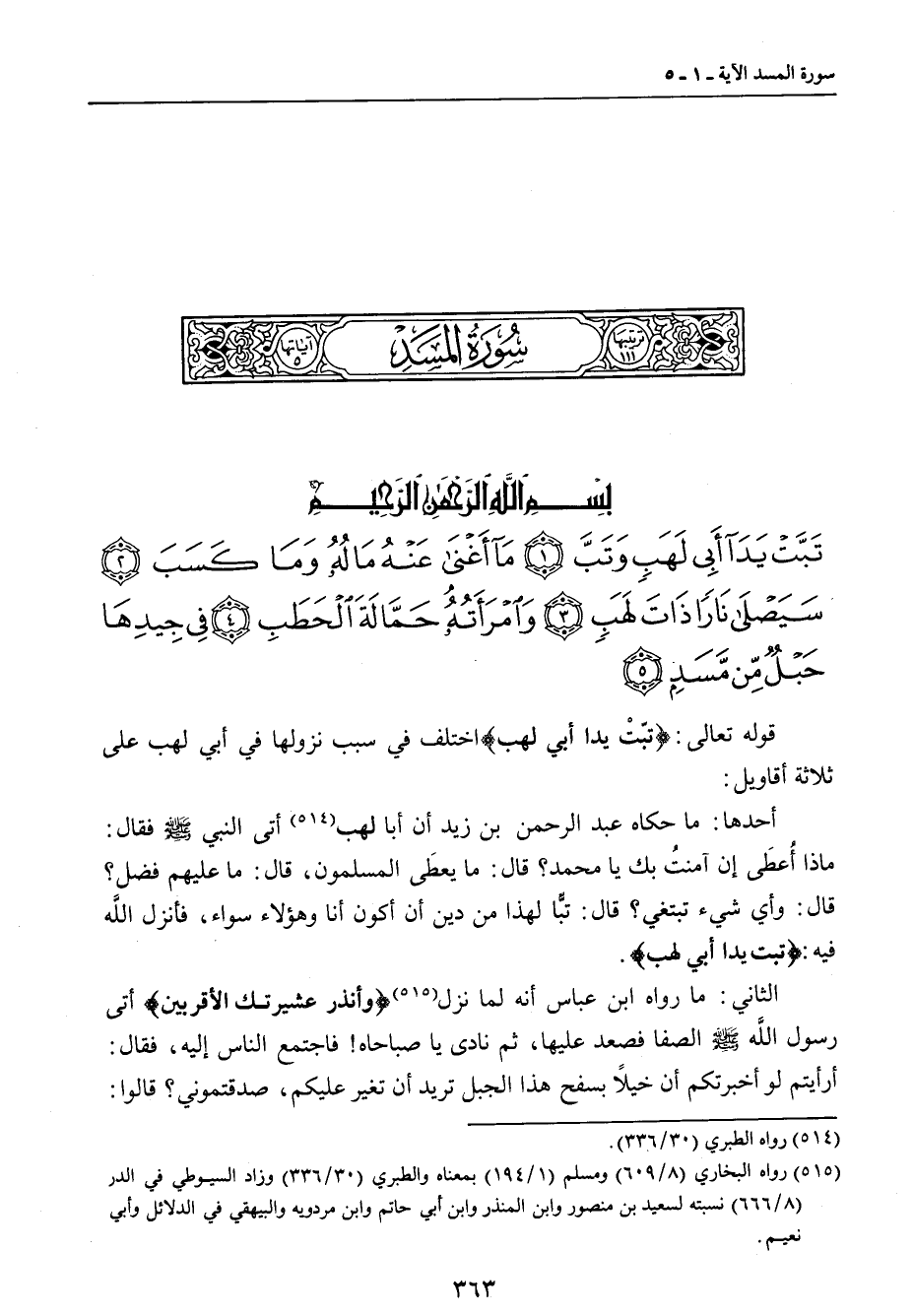 {تبت يدا أبي لهب وتب ما أغنى عنه ماله وما كسب سيصلى نارا ذات لهب وامرأته حمالة الحطب في جيدها حبل من مسد} قوله تعالى: {تبّتْ يدا أبي لهب} اختلف في سبب نزولها في أبي لهب على ثلاثة أقاويل: أحدها: ما حكاه عبد الرحمن بن زيد أن أبا لهب أتى النبي صلى الله عليه وسلم فقال: ماذا أُعطَى إن آمنتُ بك يا محمد؟ قال: ما يعطَى المسلمون , قال: ما عليهم فضل؟ قال: وأي شيء تبتغي؟ قال: تبَّا لهذا من دين أن أكون أنا وهؤلاء سواء , فأنزل الله فيه: {تبت يدا أبي لهب}. الثاني: ما رواه ابن عباس أنه لما نزل {وأنذر عشيرتك الأقربين} أتى رسول الله صلى الله عليه وسلم الصفا فصعد عليها , ثم نادى يا صباحاه! فاجتمع الناس إليه , فقال: أرأيتم لو أخبرتكم أن خيلاً بسفح هذا الجبل تريد أن تغير عليكم , صدقتموني؟ قالوا: