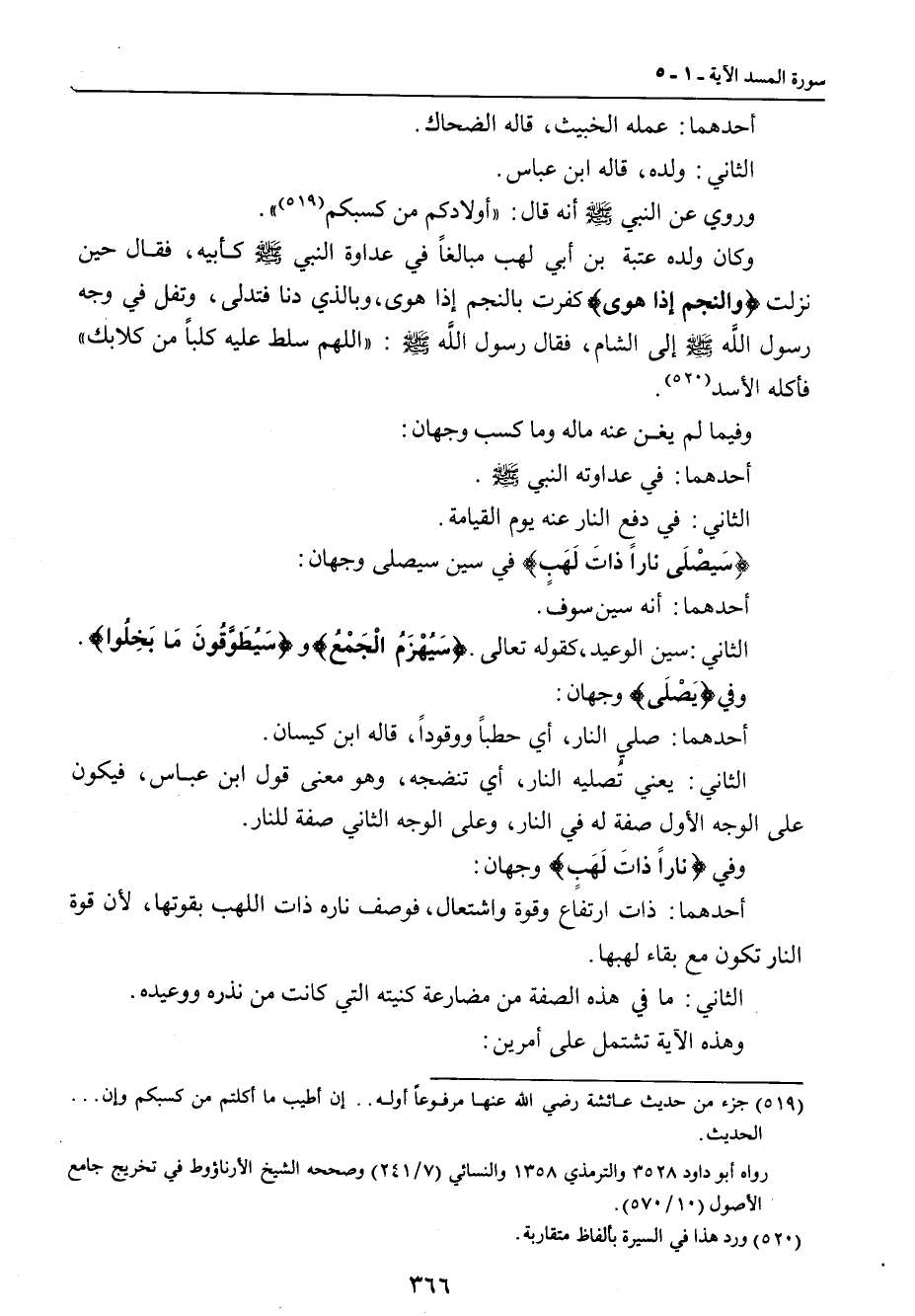 أحدهما: عمله الخبيث , قاله الضحاك. الثاني: ولده , قاله ابن عباس. وروي عن النبي صلى الله عليه وسلم أنه قال: (أولادكم من كسبكم) وكان ولده عتبة بن أبي لهب مبالغاً في عداوة النبي صلى الله عليه وسلم كأبيه , فقال حين نزلت {والنجم إذا هوى} كفرت بالنجم إذا هوى , وبالذي دنا فتدلى , وتفل في وجه رسول الله صلى الله عليه وسلم إلى الشام , فقال رسول الله صلى الله عليه وسلم: (اللهم سلط عليه كلباً من كلابك) فأكله الأسد. وفيما لم يغن عنه ماله وما كسب وجهان: أحدهما: في عداوته النبي صلى الله عليه وسلم. الثاني: في دفع النار عنه يوم القيامة. {سَيَصْلَى ناراً ذاتَ لَهَبٍ} في سين سيصلى وجهان: أحدهما: أنه سين سوف. الثاني: سين الوعيد , كقوله تعالى {سَيُهْزَمُ الْجَمْعُ} و {سَيُطَوَّقُونَ مَا بَخِلُوا} وفي {يَصْلًى} وجهان: أحدهما: صلي النار , أي حطباً ووقوداً , قاله ابن كيسان. الثاني: يعني تُصليه النار , أي تنضجه , وهو معنى قول ابن عباس , فيكون على الوجه الأول صفة له في النار , وعلى الوجه الثاني صفة للنار. وفي {ناراً ذاتَ لَهَبٍ} وجهان: أحدهما: ذات ارتفاع وقوة واشتعال , فوصف ناره ذات اللهب بقوتها , لأن قوة النار تكون مع بقاء لهبها. الثاني: ما في هذه الصفة من مضارعة كنيته التي كانت من نذره ووعيده. وهذه الآية تشتمل على أمرين: