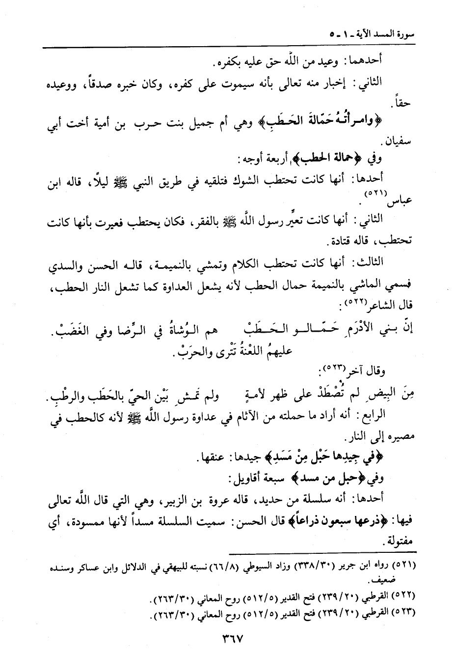 أحدهما: وعيد من الله حق عليه بكفره. الثاني: إخبار منه تعالى بأنه سيموت على كفره , وكان خبره صدقاً , ووعيده حقاً. {وامرأتُهُ حَمّالَةَ الحَطَبِ} وهي أم جميل بنت حرب بن أمية أخت أبي سفيان. وفي {حمالة الحطب} أربعة أوجه: أحدها: أنها كانت تحتطب الشوك فتلقيه في طريق النبي صلى الله عليه وسلم ليلاً , قاله ابن عباس. الثاني: أنها كانت تعيِّر رسول الله صلى الله عليه وسلم بالفقر , فكان يحتطب فعيرت بأنها كانت تحتطب , قاله قتادة. الثالث: أنها كانت تحتطب الكلام وتمشي بالنميمة , قاله الحسن والسدي فسمي الماشي بالنميمة حمال الحطب لأنه يشعل العداوة كما تشعل النار الحطب , قال الشاعر: