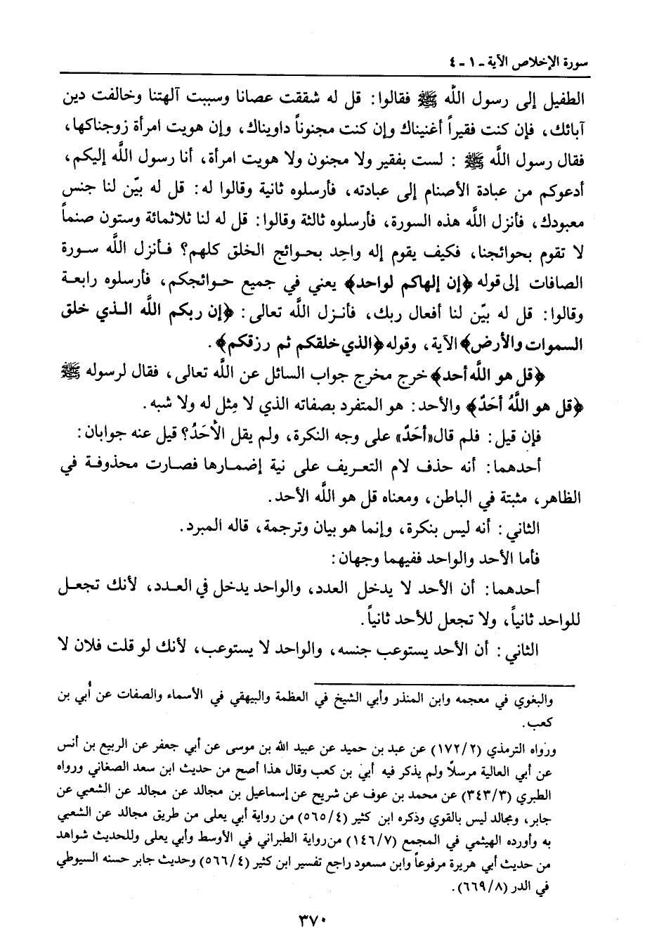 الطفيل إلى رسول الله صلى الله عليه وسلم فقالوا: قل له شققت عصانا وسببت آلهتنا وخالفت دين آبائك , فإن كنت فقيراً أغنيناك وإن كنت مجنوناً داويناك , وإن هويت امرأة زوجناكها , فقال رسول الله صلى الله عليه وسلم: (لست بفقير ولا مجنون ولا هويت امرأة , أنا رسول الله إليكم , أدعوكم من عبادة الأصنام إلى عبادته ,) فأرسلوه ثانية وقالوا له: قل له بيّن لنا جنس معبودك , فأنزل الله هذه السورة , فأرسلوه ثالثة وقالوا: قل له لنا ثلاثمائة وستون صنماً لا تقوم بحوائجنا , فكيف يقوم إله واحِد بحوائج الخلق كلهم؟ فأنزل الله سورة الصافات إلى قوله {إن إلهاكم لواحد} يعني في جميع حوائجكم , فأرسلوه رابعة وقالوا: قل له بيّن لنا أفعال ربك , فأنزل الله تعالى: {إن ربكم الله الذي خلق السموات والأرض} الآية , وقوله {الذي خلقكم ثم رزقكم}. {قل هو الله أحد} خرج مخرج جواب السائل عن الله تعالى , فقال لرسوله صلى الله عليه وسلم {قل هو اللهُ أحَدٌ} والأحد: هو المتفرد بصفاته الذي لا مِثل له ولا شبه. فإن قيل: فلم قال (أحَدٌ) على وجه النكرة , ولم يقل الأحَدُ؟ قيل عنه جوابان: أحدهما: أنه حذف لام التعريف على نية إضمارها فصارت محذوفة في الظاهر , مثبتة في الباطن , ومعناه قل هو الله الأحد. الثاني: أنه ليس بنكرة , وإنما هو بيان وترجمة , قاله المبرد. فأما الأحد والواحد ففيهما وجهان: أحدهما: أن الأحد لا يدخل العدد , والواحد يدخل في العدد , لأنك تجعل للواحد ثانياً , ولا تجعل للأحد ثانياً. الثاني: أن الأحد يستوعب جنسه , والواحد لا يستوعب , لأنك لو قلت فلان لا