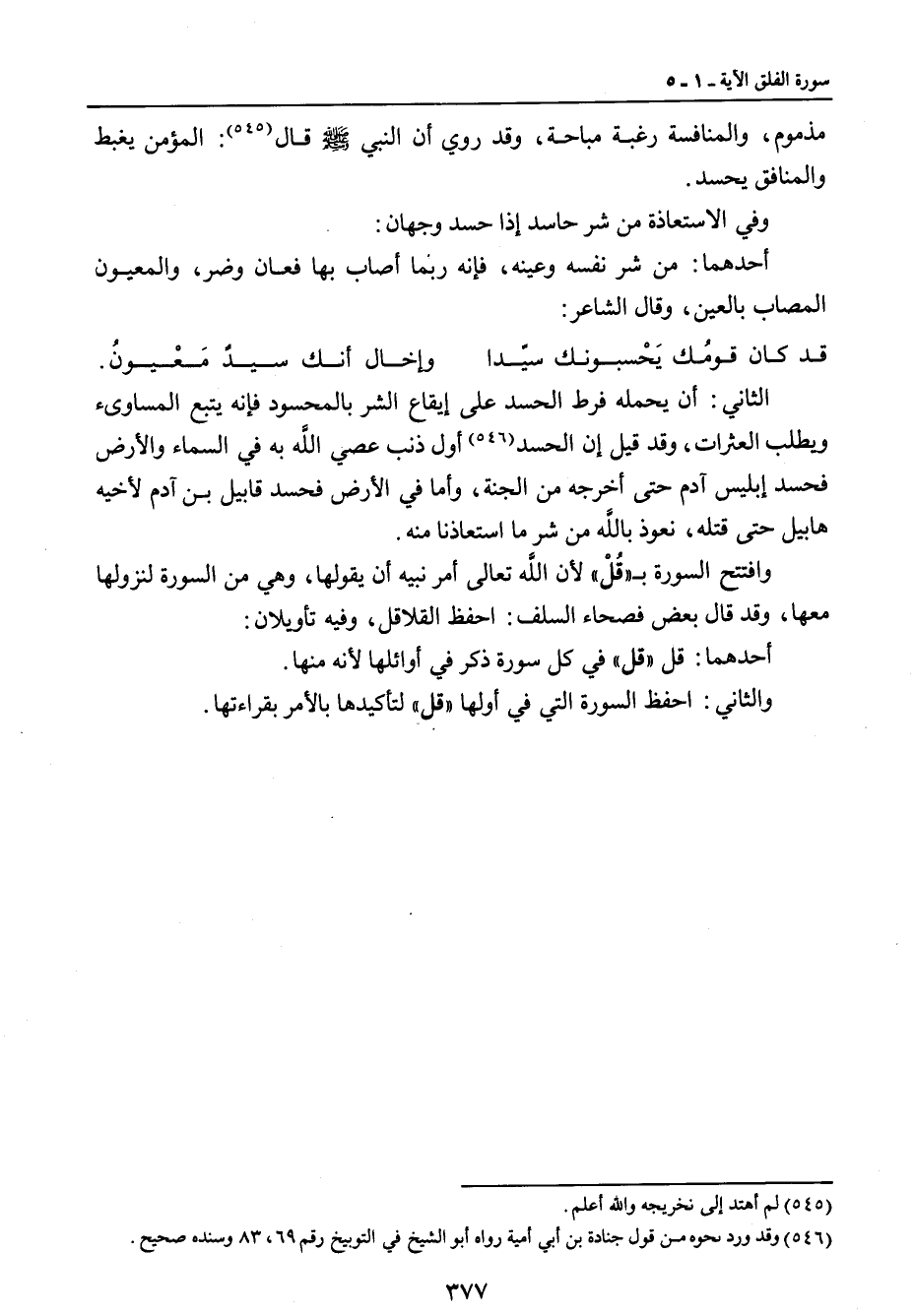الثاني: أن يحمله فرط الحسد على إيقاع الشر بالمحسود فإنه يتبع المساوىء ويطلب العثرات , وقد قيل إن الحسد أول ذنب عصي الله به في السماء والأرض فحسد إبليس آدم حتى أخرجه من الجنة , وأما في الأرض فحسد قابيل بن آدم لأخيه هابيل حتى قتله , نعوذ بالله من شر ما استعاذنا منه. وافتتح السورة ب (قُلْ) لأن الله تعالى أمر نبيه أن يقولها , وهي من السورة لنزولها معها , وقد قال بعض فصحاء السلف: احفظ القلاقل , وفيه تأويلان: أحدهما: قل (قل) في كل سورة ذكر في أوائلها لأنه منها. والثاني: احفظ السورة التي في أولها (قل) لتأكيدها بالأمر بقراءتها.
