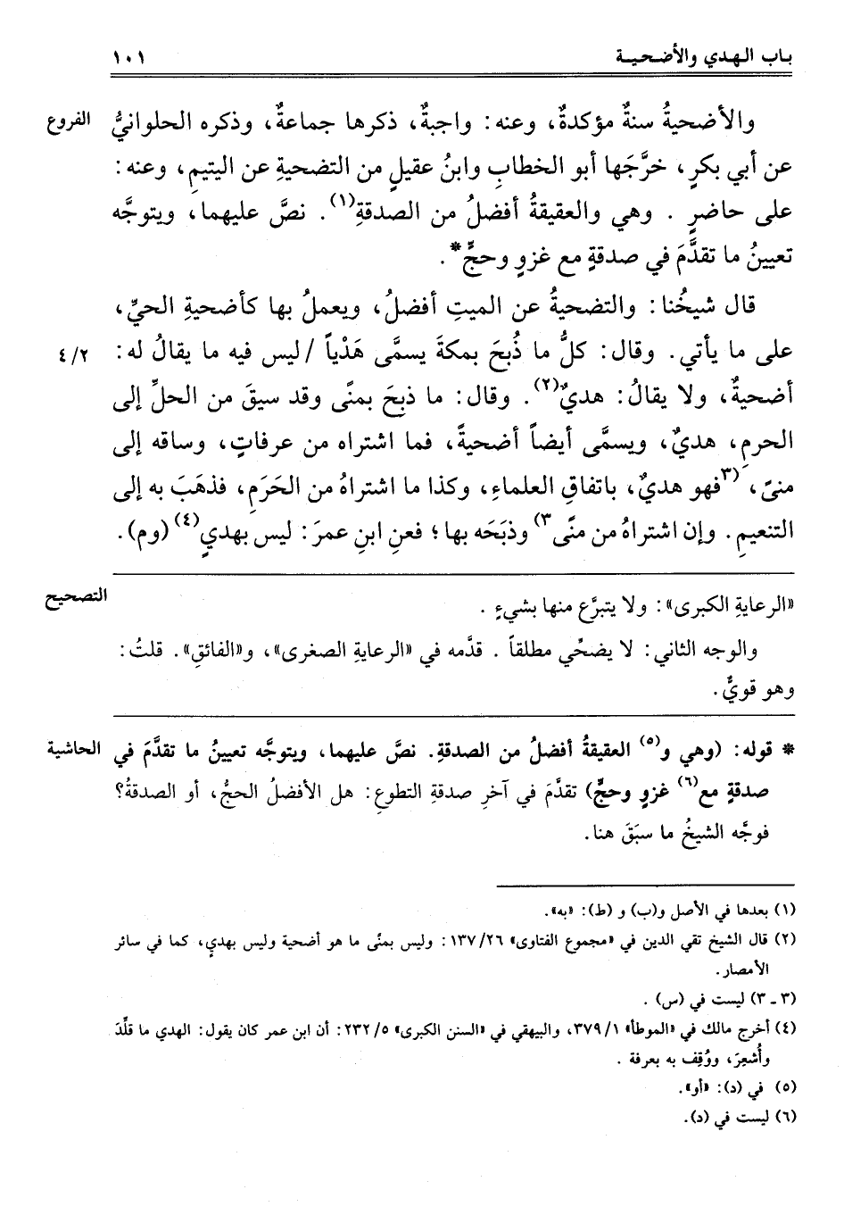 وَالْأُضْحِيَّةُ سُنَّةٌ مُؤَكَّدَةٌ, وَعَنْهُ وَاجِبَةٌ, ذَكَرَهَا جَمَاعَةٌ, وَذَكَرَهُ الْحَلْوَانِيُّ عَنْ أَبِي بَكْرٍ, وَخَرَّجَهَا أَبُو الْخَطَّابِ وَابْنُ عَقِيلٍ مِنْ التَّضْحِيَةِ عَنْ الْيَتِيمِ, وَعَنْهُ: عَلَى حَاضِرٍ, وَهِيَ وَالْعَقِيقَةُ أَفْضَلُ مِنْ الصدقة1 به. نَصَّ عَلَيْهِمَا, وَيَتَوَجَّهُ تَعْيِينُ مَا تَقَدَّمَ فِي صَدَقَةٍ مَعَ غَزْوٍ وَحَجٍّ.