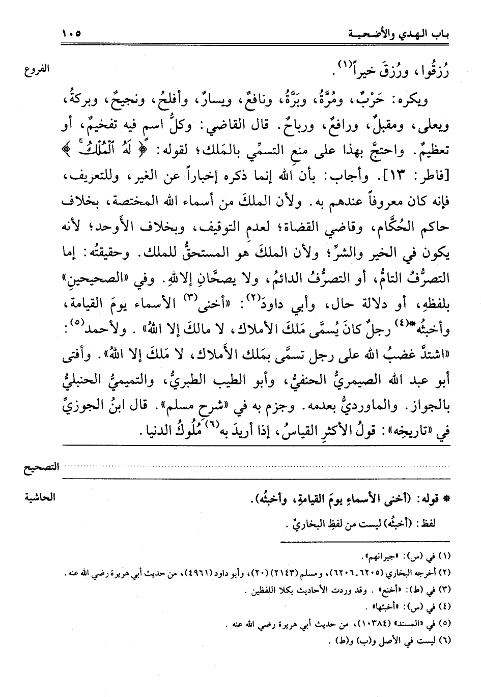 وَيُكْرَهُ حَرْبٌ وَمُرَّةُ وَبُرَّةُ وَنَافِعٌ وَيَسَارٌ وَأَفْلَحُ وَنَجِيحٌ وَبَرَكَةُ وَيَعْلَى وَمُقْبِلُ وَرَافِعٌ وَرَبَاحٌ, قَالَ الْقَاضِي: وَكُلُّ اسْمٍ فِيهِ تَفْخِيمٌ أَوْ تَعْظِيمٌ, وَاحْتَجَّ بِهَذَا عَلَى مَنْعِ التسمي بالملك, لقوله " {لَهُ الْمُلْكُ} [فاطر: 13] " وَأَجَابَ بِأَنَّ اللَّهَ إنَّمَا ذَكَرَهُ إخْبَارًا عَنْ الْغَيْرِ وَلِلتَّعْرِيفِ, فَإِنَّهُ كَانَ مَعْرُوفًا عِنْدَهُمْ بِهِ ; وَلِأَنَّ الْمَلِكَ مِنْ أَسْمَاءِ اللَّهِ الْمُخْتَصَّةِ بِخِلَافِ حَاكِمِ الْحُكَّامِ وَقَاضِي الْقُضَاةِ, لِعَدَمِ التَّوْقِيفِ, وَبِخِلَافِ الْأَوْحَدِ ; لِأَنَّهُ يَكُونُ فِي الْخَيْرِ وَالشَّرِّ ; وَلِأَنَّ الْمَلِكَ هُوَ الْمُسْتَحَقُّ لِلْمِلْكِ وَحَقِيقَتُهُ إمَّا التَّصَرُّفُ التَّامُّ أَوْ التَّصَرُّفُ الدَّائِمُ وَلَا يَصِحَّانِ إلَّا لِلَّهِ وَفِي الصَّحِيحَيْنِ بِلَفْظِهِ أَوْ دَلَالَةِ حَالٍ وأبي داود2: "أخنى3 الأسماء يوم القيامة وأخبثه*4 رَجُلٌ كَانَ يُسَمَّى مَلِكَ الْأَمْلَاكِ, لَا مَالِكَ إلَّا اللَّهُ" وَلِأَحْمَدَ5 " اشْتَدَّ غَضَبُ اللَّهِ عَلَى رَجُلٍ تَسَمَّى مَلِكَ. الْأَمْلَاكِ, لَا مَلِكَ إلَّا اللَّهُ" وَأَفْتَى أَبُو عَبْدِ اللَّهِ الصَّيْمَرِيُّ الْحَنَفِيُّ وَأَبُو الطَّيِّبِ الطَّبَرِيُّ وَالتَّمِيمِيُّ الْحَنْبَلِيُّ بِالْجَوَازِ, وَالْمَاوَرْدِيُّ بِعَدَمِهِ, وَجَزَمَ بِهِ فِي شَرْحِ مُسْلِمٍ, قَالَ ابْنُ الْجَوْزِيِّ فِي تَارِيخِهِ: قَوْلُ الْأَكْثَرِ الْقِيَاسُ إذا أريد به6 ملوك الدنيا,