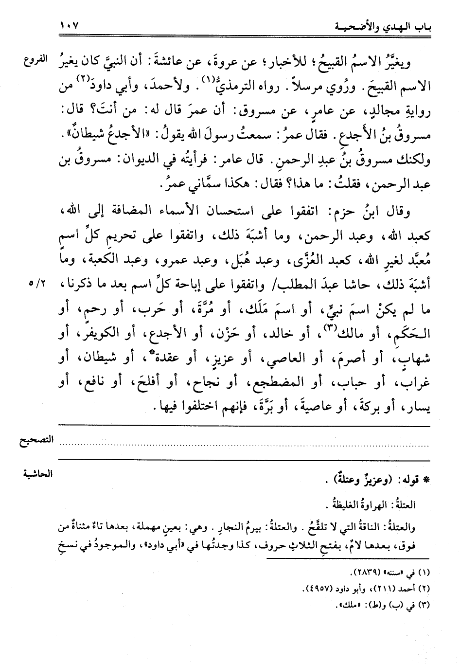 وَيُغَيَّرُ الِاسْمُ الْقَبِيحُ, لِلْأَخْبَارِ عَنْ عُرْوَةَ عَنْ عائشة أَنَّ النَّبِيَّ صَلَّى اللَّهُ عَلَيْهِ وَسَلَّمَ كَانَ يُغَيِّرُ الِاسْمَ الْقَبِيحَ, وَرُوِيَ مُرْسَلًا, رَوَاهُ الترمذي1 ولأحمد, وأبي دَاوُد2 مِنْ رِوَايَةِ مُجَالِدٍ عَنْ عَامِرٍ عَنْ مَسْرُوقٍ أَنَّ عُمَرَ قَالَ لَهُ, مِنْ أَنْتَ؟ قَالَ: مَسْرُوقُ بْنُ الْأَجْدَعِ, فَقَالَ عُمَرُ: سَمِعْت رسول الله صلى الله عليه وسلم يقول الْأَجْدَعُ شَيْطَانٌ وَلَكِنَّك مَسْرُوقُ بْنُ عَبْدِ الرَّحْمَنِ. قَالَ عَامِرٌ: فَرَأَيْته فِي الدِّيوَانِ: مَسْرُوقُ بْنُ عَبْدِ الرَّحْمَنِ, فَقُلْت: مَا هَذَا؟ فَقَالَ: هَكَذَا سَمَّانِي عُمَرُ.