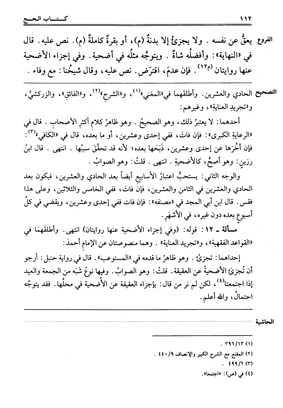 "مَسْأَلَةٌ 12" قَوْلُهُ: وَفِي إجْزَاءِ الْأُضْحِيَّةِ عَنْهَا رِوَايَتَانِ, انْتَهَى. وَأَطْلَقَهُمَا فِي الْقَوَاعِدِ الْفِقْهِيَّةِ وَتَجْرِيدِ الْعِنَايَةِ, وَهُمَا مَنْصُوصَتَانِ عَنْ الْإِمَامِ أَحْمَدَ.