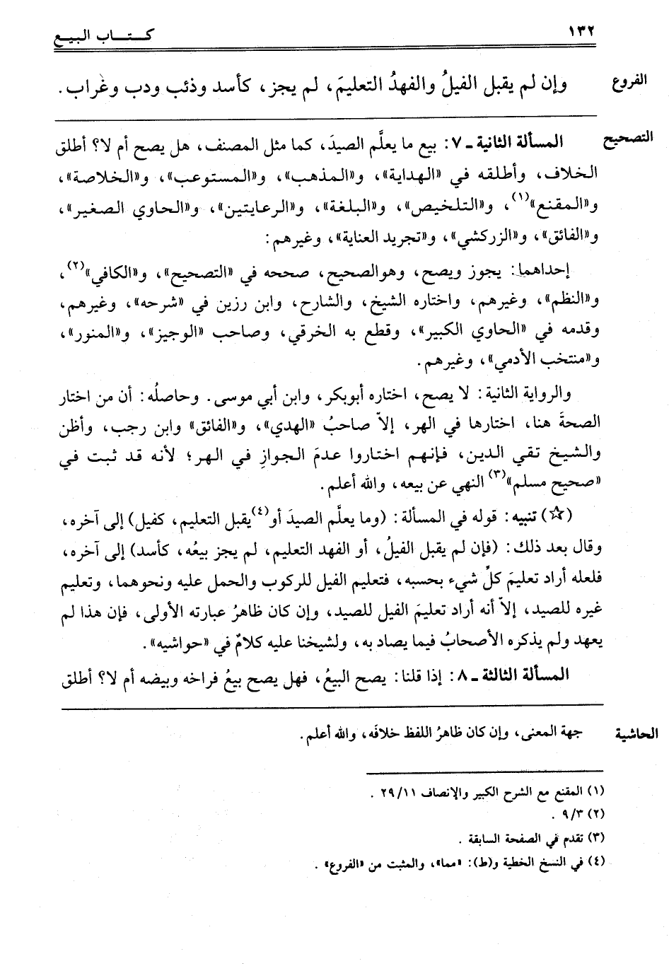 ـــــــــــــــــــــــــــــQ"الْمَسْأَلَةُ الثَّانِيَةُ 7" بَيْعُ مَا يَعْلَمُ الصَّيْدَ, كَمَا مَثَّلَ الْمُصَنِّفُ, هَلْ يَصِحُّ أَمْ لَا؟ أَطْلَقَ الْخِلَافَ, وَأَطْلَقَهُ فِي الْهِدَايَةِ وَالْمُذْهَبِ وَالْمُسْتَوْعِبِ وَالْخُلَاصَةِ وَالْمُقْنِعِ وَالتَّلْخِيصِ وَالْبُلْغَةِ وَالرِّعَايَتَيْنِ وَالْحَاوِي الصَّغِيرِ وَالْفَائِقِ وَالزَّرْكَشِيِّ وَتَجْرِيدِ الْعِنَايَةِ وَغَيْرِهِمْ. إحْدَاهُمَا يَصِحُّ, وَهُوَ الصَّحِيحُ, صَحَّحَهُ فِي التَّصْحِيحِ وَالْكَافِي وَالنَّظْمِ وَغَيْرِهِمْ, وَاخْتَارَهُ الشَّيْخُ وَالشَّارِحُ وَابْنُ رَزِينٍ وَغَيْرُهُمْ, وَقَدَّمَهُ فِي الْحَاوِي الْكَبِيرِ, وَقَطَعَ بِهِ الْخِرَقِيُّ وَصَاحِبُ الْوَجِيزِ وَالْمُنَوِّرِ وَمُنْتَخَبِ الْآدَمِيِّ وَغَيْرُهُمْ. وَالرِّوَايَةُ الثَّانِيَةُ لَا يَصِحُّ, اخْتَارَهُ أَبُو بَكْرٍ وَابْنُ أَبِي مُوسَى, وَحَاصِلُهُ أَنَّ مَنْ اخْتَارَ الصِّحَّةَ هُنَا اخْتَارَهَا فِي الْهِرِّ, إلَّا صَاحِبَ الْهَدْيِ وَالْفَائِقِ وَابْنَ رَجَبٍ, وَأَظُنُّ وَالشَّيْخَ تَقِيَّ الدِّينِ, فَإِنَّهُمْ اخْتَارُوا عَدَمَ الْجَوَازِ فِي الْهِرِّ, لِأَنَّهُ قَدْ ثَبَتَ فِي صَحِيحِ مُسْلِمٍ النَّهْيُ عَنْ بَيْعِهِ, وَاَللَّهُ أَعْلَمُ. "تَنْبِيهٌ" قَوْلُهُ فِي الْمَسْأَلَةِ: وَمَا يَعْلَمُ الصَّيْدَ مِمَّا يَقْبَلُ التَّعْلِيمَ كَفِيلٍ, وَإِلَى آخره, وَقَالَ بَعْدَ ذَلِكَ: فَإِنْ لَمْ يَقْبَلْ الْفِيلُ أَوْ الْفَهْدُ التَّعْلِيمَ لَمْ يَجُزْ بَيْعُهُ كَأَسَدٍ إلَى آخِرِهِ, فَلَعَلَّهُ أَرَادَ أَنَّ تَعْلِيمَ كُلِّ شَيْءٍ بِحَسَبِهِ فَتَعْلِيمُ الْفِيلِ لِلرُّكُوبِ وَالْحَمْلِ عَلَيْهِ وَنَحْوِهِمَا, وَتَعْلِيمُ غَيْرِهِ لِلصَّيْدِ, إلَّا أَنَّهُ أَرَادَ تَعْلِيمَ الْفِيلِ لِلصَّيْدِ, وَإِنْ كَانَ ظَاهِرُ عِبَارَتِهِ الْأُولَى, فَإِنَّ هَذَا لَمْ يَعْهَدْهُ وَلَمْ يَذْكُرْهُ الْأَصْحَابُ فِيمَا يُصَادُ بِهِ, وَلِشَيْخِنَا عَلَيْهِ كَلَامٌ فِي حَوَاشِيهِ.