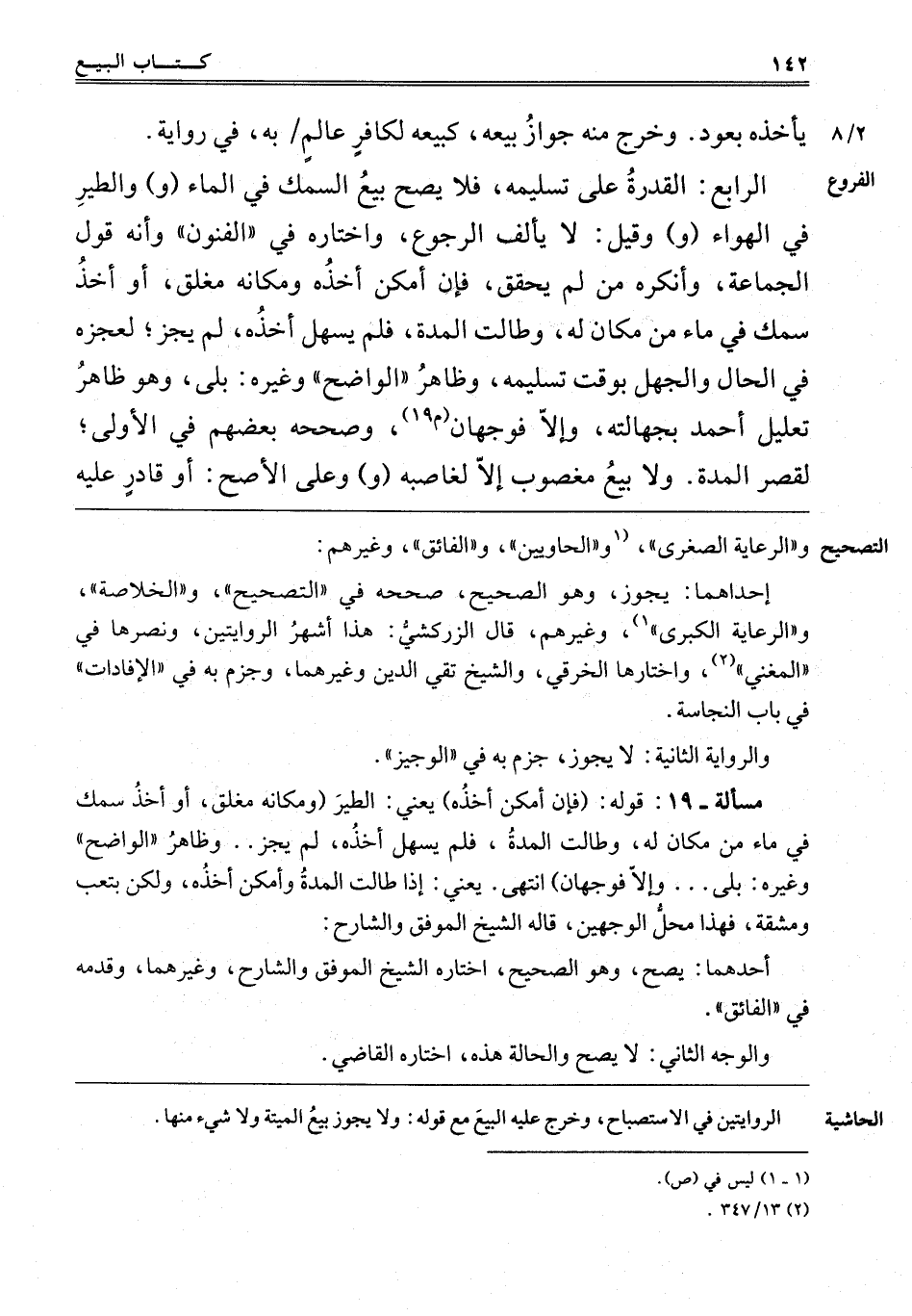 "مَسْأَلَةٌ 19" قَوْلُهُ: فَإِنْ أَمْكَنَ أَخْذُهُ يَعْنِي الطَّيْرَ وَمَكَانُهُ مُغْلَقٌ أَوْ أَخْذُ سَمَكٍ فِي مَاءٍ مِنْ مَكَان لَهُ وَطَالَتْ الْمُدَّةُ فَلَمْ يَسْهُلْ أَخْذُهُ لَمْ يَجُزْ. وَظَاهِرُ الْوَاضِحِ وَغَيْرِهِ: بَلَى وَإِلَّا فَوَجْهَانِ, انْتَهَى. يَعْنِي إذَا طَالَتْ الْمُدَّةُ وَأَمْكَنَ أَخْذُهُ وَلَكِنْ بِتَعَبٍ وَمَشَقَّةٍ فَهَذَا مَحَلُّ الْوَجْهَيْنِ, قَالَهُ الشَّيْخُ الْمُوَفَّقُ وَالشَّارِحُ: