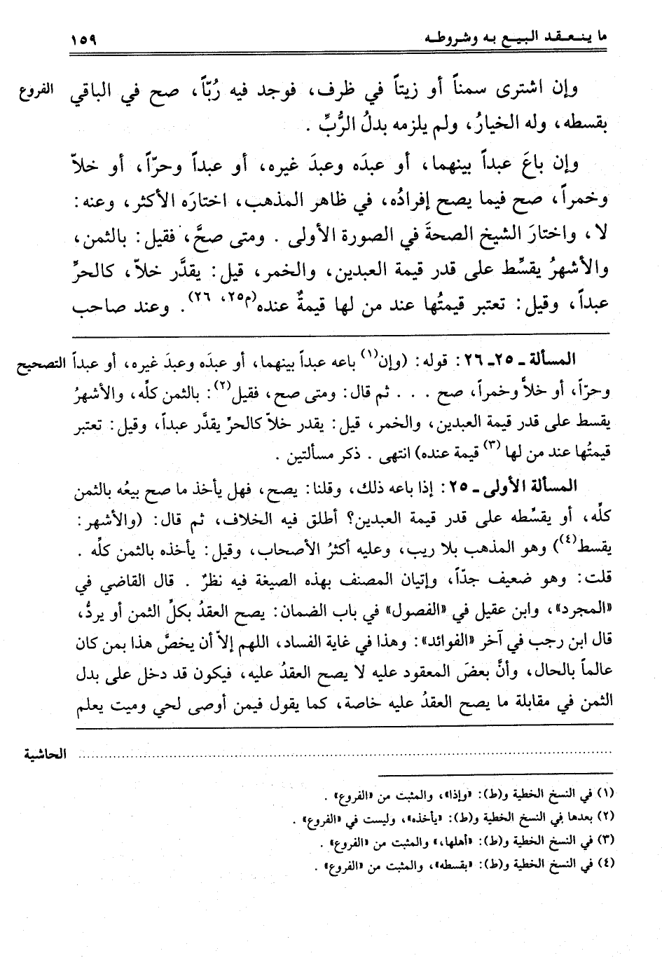 "الْمَسْأَلَةُ الْأُولَى 25" إذَا بَاعَهُ ذَلِكَ وَقُلْنَا يَصِحُّ, فَهَلْ يَأْخُذُ مَا صَحَّ بَيْعُهُ كُلَّهُ أَوْ يُقَسِّطُهُ عَلَى قَدْرِ قِيمَةِ الْعَبْدَيْنِ؟ أَطْلَقَ فِيهِ الْخِلَافَ, ثُمَّ قَالَ: وَالْأَشْهَرُ يقسط4, وَهُوَ الْمَذْهَبُ بِلَا رَيْبٍ, وَعَلَيْهِ أَكْثَرُ الْأَصْحَابِ, وَقِيلَ: يَأْخُذُهُ بِالثَّمَنِ كُلِّهِ "قُلْت": وَهُوَ ضَعِيفٌ جِدًّا, وَإِتْيَانُ الْمُصَنِّفِ بِهَذِهِ الصِّيغَةِ فِيهِ نَظَرٌ, قَالَ الْقَاضِي فِي الْمُجَرَّدِ وَابْنُ عَقِيلٍ فِي الْفُصُولِ فِي بَابِ الضَّمَانِ: يَصِحُّ الْعَقْدُ بِكُلِّ الثمن أو برد, قال ابن رجب فِي آخِرِ الْفَوَائِدِ: وَهَذِهِ فِي غَايَةِ الْفَسَادِ, اللَّهُمَّ إلَّا أَنْ يَخُصَّ هَذَا بِمَنْ كَانَ عَالِمًا بِالْحَالِ وَإِنَّ بَعْضَ الْعُقُودِ عَلَيْهِ لَا يَصِحُّ الْعَقْدُ عَلَيْهِ, فَيَكُونُ قَدْ دَخَلَ عَلَى بَدَلِ الثَّمَنِ فِي مُقَابَلَةِ مَا يَصِحُّ الْعَقْدُ عَلَيْهِ خَاصَّةً كَمَا يَقُولُ فِيمَنْ أَوْصَى لِحَيٍّ وميت يعلم