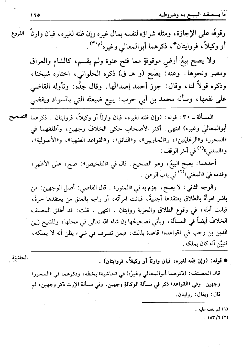 ـــــــــــــــــــــــــــــQ"المسألة 30" قَوْلُهُ: وَإِنْ ظَنَّهُ لِغَيْرِهِ فَبَانَ وَارِثًا أَوْ وَكِيلًا فَرِوَايَتَانِ. ذَكَرَهُمَا أَبُو الْمَعَالِي وَغَيْرُهُ, انْتَهَى. أَكْثَرُ الْأَصْحَابِ حَكَى الْخِلَافَ وَجْهَيْنِ, وَأَطْلَقَهُمَا فِي الْمُحَرَّرِ وَالرِّعَايَتَيْنِ وَالْحَاوِيَيْنِ وَالْفَائِقِ وَالْقَوَاعِدِ الْفِقْهِيَّةِ وَالْأُصُولِيَّةِ, وَالْمُغْنِي1 فِي آخِرِ الْوَقْفِ.