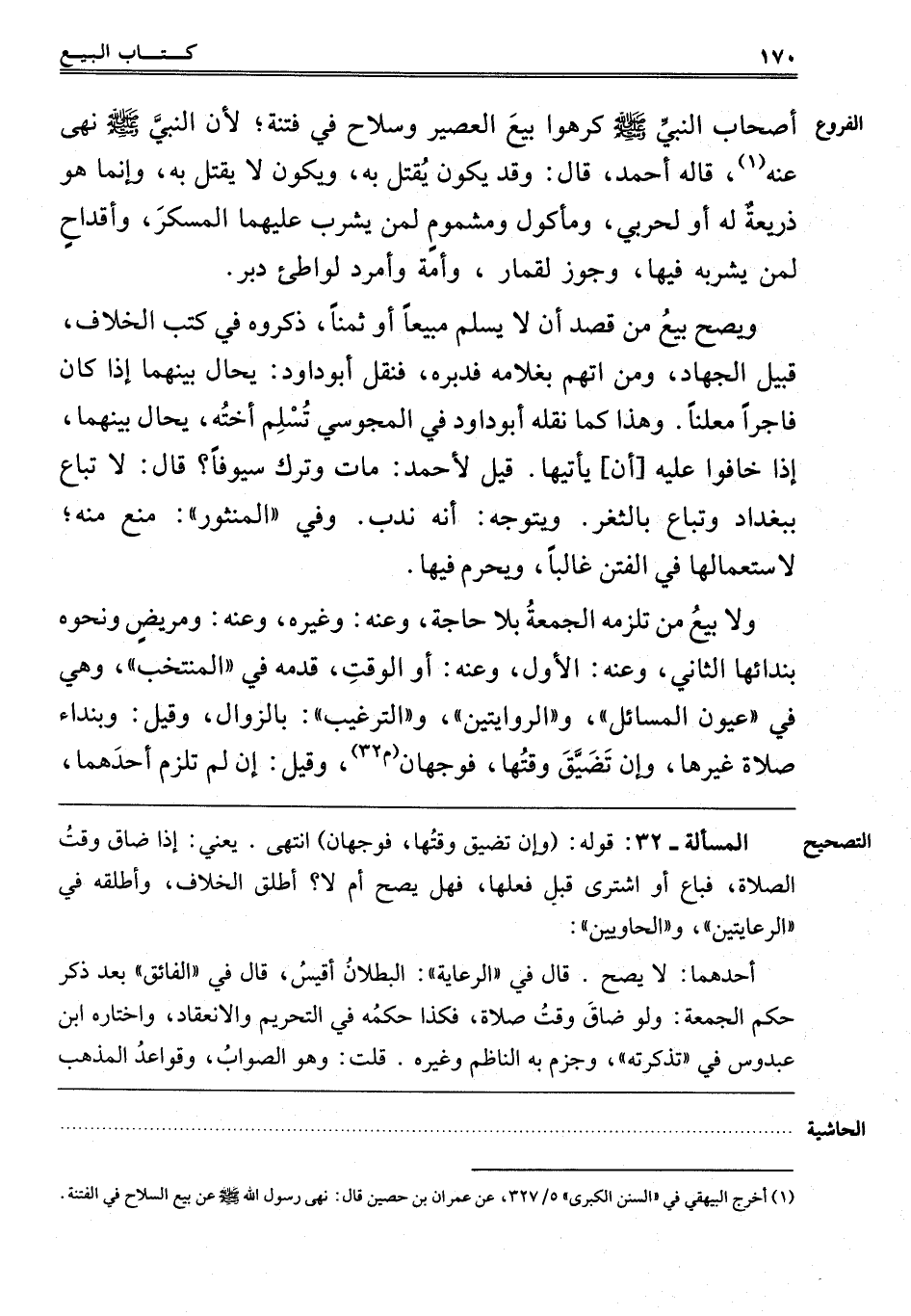 1 أخرج البيهقي في السنن الكبرى 5/327, عن عمران بن حصين قَالَ: نَهَى رَسُولُ اللَّهِ صَلَّى اللَّهُ عَلَيْهِ وَسَلَّمَ عن بيع السلاح في الفتنة.