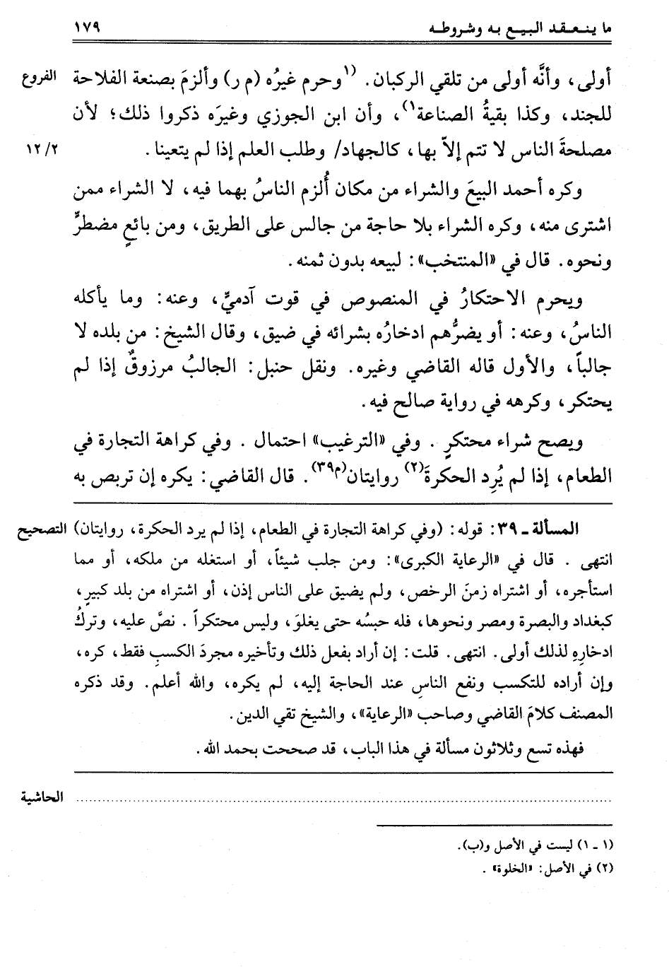 ـــــــــــــــــــــــــــــQ"مَسْأَلَةٌ 39" قَوْلُهُ: وَفِي كَرَاهَةِ التِّجَارَةِ فِي الطَّعَامِ إذَا لَمْ يُرِدْ الِاحْتِكَارَ رِوَايَتَانِ, انْتَهَى. قَالَ فِي الرِّعَايَةِ الْكُبْرَى: وَمَنْ جَلَبَ شَيْئًا, أَوْ اسْتَغَلَّهُ مِنْ مِلْكِهِ أَوْ مِمَّا اسْتَأْجَرَهُ, أَوْ اشْتَرَاهُ زَمَنَ الرُّخْصِ, وَلَمْ يُضَيِّقْ عَلَى النَّاسِ إذَنْ, أَوْ اشْتَرَاهُ مِنْ بَلَدٍ كَبِيرٍ كَبَغْدَادَ وَالْبَصْرَةِ وَمِصْرَ وَنَحْوِهَا, فَلَهُ حَبْسُهُ حَتَّى يَغْلُوَ. وَلَيْسَ مُحْتَكِرًا, نَصَّ عَلَيْهِ. وَتَرْكُ ادِّخَارِهِ لِذَلِكَ أَوْلَى, انْتَهَى. "قُلْت": إنْ أَرَادَ بِفِعْلِ ذَلِكَ وَتَأْخِيرِهِ مُجَرَّدَ الْكَسْبِ فَقَطْ كُرِهَ, وَإِنْ أَرَادَهُ لِلتَّكَسُّبِ وَنَفْعِ النَّاسِ عِنْدَ الْحَاجَةِ إلَيْهِ لَمْ يُكْرَهْ, وَاَللَّهُ أَعْلَمُ, وَقَدْ ذَكَرَ الْمُصَنِّفُ كَلَامَ الْقَاضِي وَصَاحِبِ الرِّعَايَةِ وَالشَّيْخِ تَقِيِّ الدِّينِ.