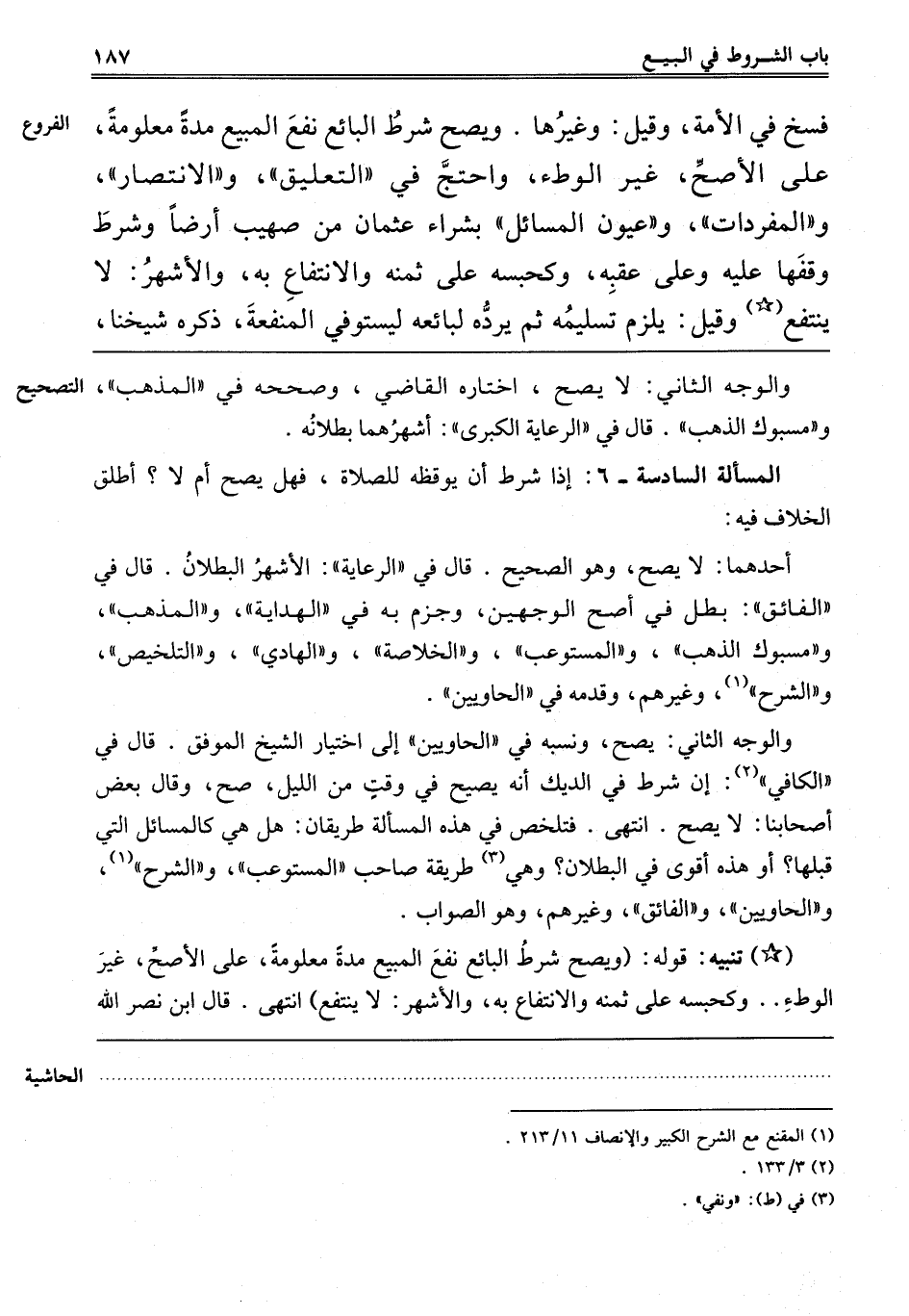 "*" تَنْبِيهٌ: قَوْلُهُ: وَيَصِحُّ شَرْطُ الْبَائِعِ نفع المبيع مدة معلومة, على الأصح, غير الْوَطْءِ. وَكَحَبْسَةِ عَلَى ثَمَنِهِ وَالِانْتِفَاعِ بِهِ, وَالْأَشْهَرُ: لَا يَنْتَفِعُ, انْتَهَى. قَالَ ابْنُ نَصْرِ اللَّهِ