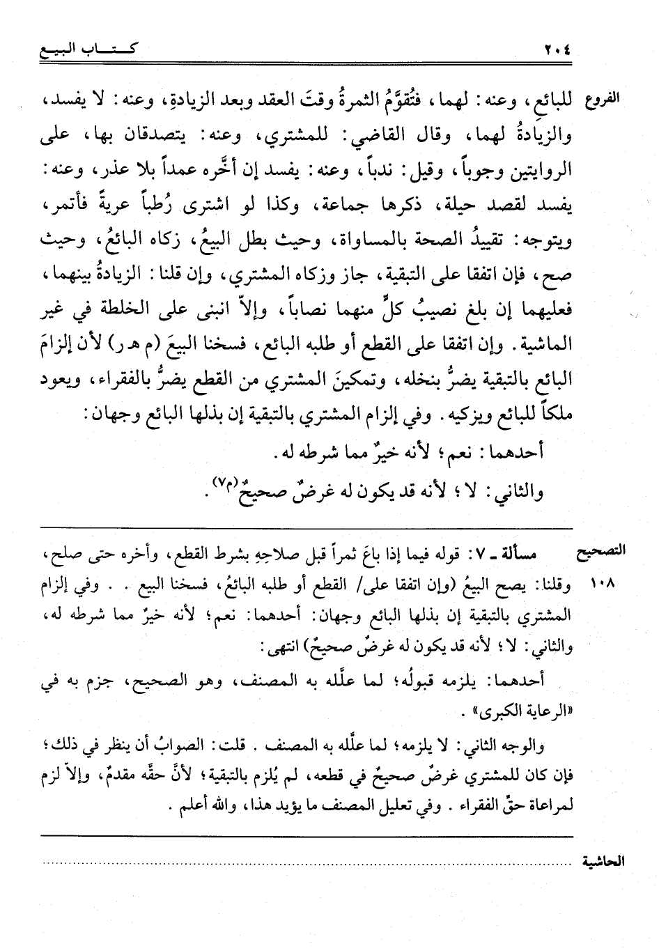 ـــــــــــــــــــــــــــــQ"مَسْأَلَةٌ 7" قَوْلُهُ: فِيمَا إذَا بَاعَ ثَمَرًا قَبْلَ صَلَاحِهِ بِشَرْطِ الْقَطْعِ وَأَخَّرَهُ حَتَّى صَلُحَ وَقُلْنَا يَصِحُّ الْبَيْعُ: وَإِنْ اتَّفَقَا عَلَى الْقَطْعِ أَوْ طَلَبَهُ الْبَائِعُ فَسَخْنَا الْبَيْعَ, وَفِي الْتِزَامِ الْمُشْتَرِي بِالتَّبْقِيَةِ إنْ بَذَلَهَا الْبَائِعُ وَجْهَانِ: أَحَدُهُمَا نَعَمْ, لِأَنَّهُ خَيْرٌ مِمَّا شَرَطَهُ لَهُ. وَالثَّانِي لَا, لِأَنَّهُ قَدْ يَكُونُ لَهُ غَرَضٌ صَحِيحٌ, انْتَهَى.
