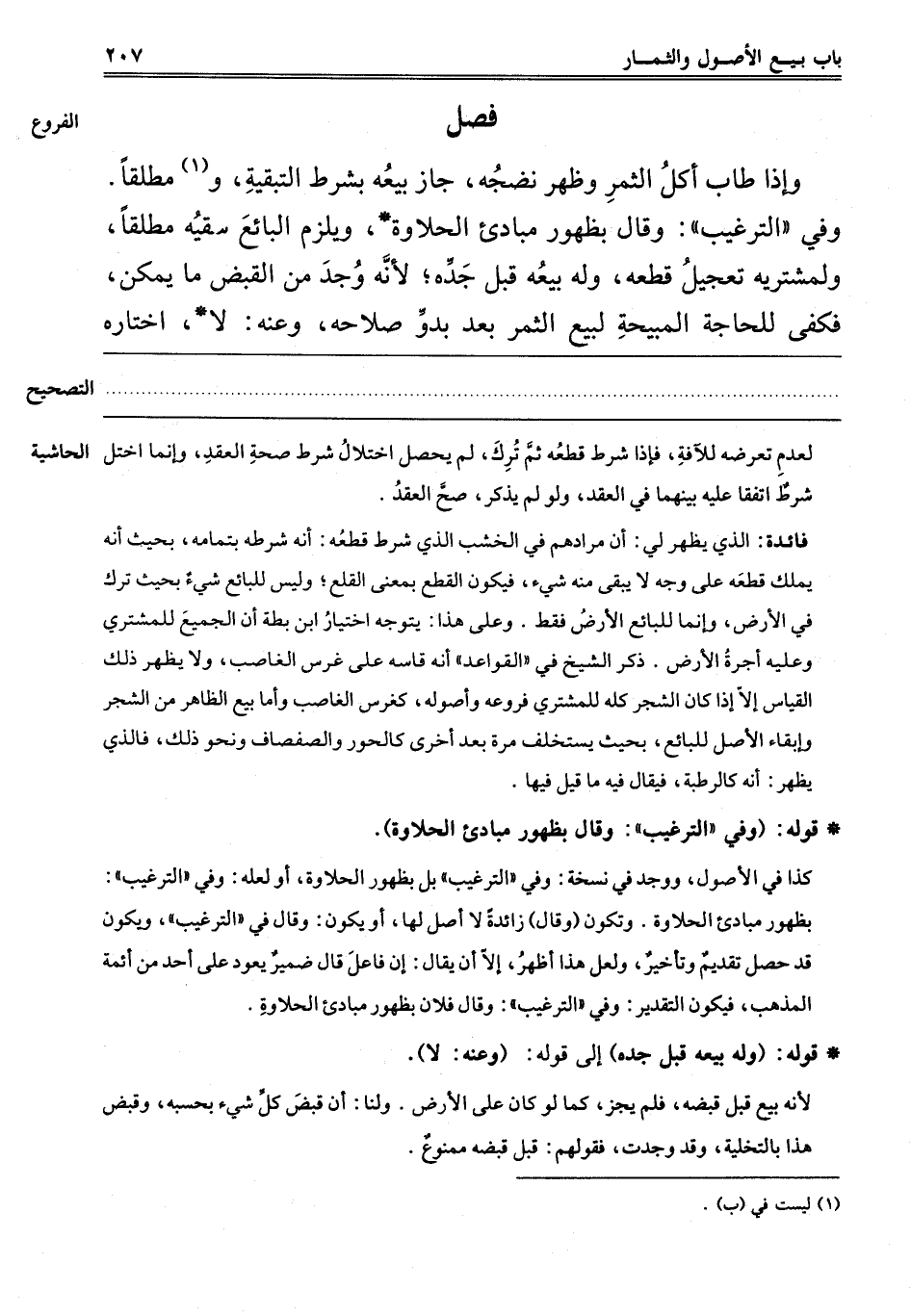و1مطلقا. وَفِي التَّرْغِيبِ وَقَالَ بِظُهُورِ مَبَادِئِ الْحَلَاوَةِ, وَيَلْزَمُ الْبَائِعَ سَقْيُهُ مُطْلَقًا, وَلِمُشْتَرِيهِ, تَعْجِيلُ قَطْعِهِ, وَلَهُ بَيْعُهُ قَبْلَ جَذِّهِ, لِأَنَّهُ وُجِدَ مِنْ الْقَبْضِ مَا يُمْكِنُ, فَكَفَى لِلْحَاجَةِ الْمُبِيحَةِ لِبَيْعِ الثَّمَرِ بعد بدو صلاحه, وعنه: لا, اختاره