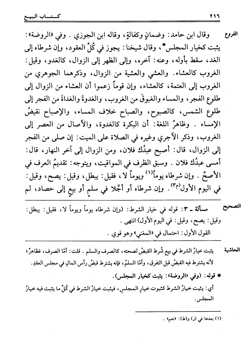 وَقَالَ ابْنُ حَامِدٍ: وَضَمَانٌ وَكَفَالَةٌ, وَقَالَهُ ابْنُ الْجَوْزِيِّ. وَفِي الرَّوْضَةِ: يَثْبُتُ كَخِيَارِ الْمَجْلِسِ, وَقَالَ شَيْخُنَا: يَجُوزُ فِي كُلِّ الْعُقُودِ. وَإِنْ شَرْطَاهُ إلَى الْغَدِ سَقَطَ بِأَوَّلِهِ, وَعَنْهُ آخِرُهُ, وَإِلَى الظُّهْرِ إلَى الزَّوَالِ, كَالْغُدُوِّ, وَقِيلَ: الْغُرُوبُ كَالْعِشَاءِ. والعشي والعشية من الزوال وذكرهما الجوهري مِنْ الْغُرُوبِ إلَى الْعَتَمَةِ, كَالْعِشَاءِ, وَأَنَّ قَوْمًا زَعَمُوا أَنَّ الْعِشَاءَ مِنْ الزَّوَالِ إلَى طُلُوعِ الْفَجْرِ, وَالْمَسَاءُ وَالْغُبُوقُ مِنْ الْغُرُوبِ, وَالْغَدْوَةُ وَالْغَدَاةُ مِنْ الْفَجْرِ إلَى طُلُوعِ الشَّمْسِ, كَالصَّبُوحِ, وَالصَّبَاحُ خِلَافُ الْمَسَاءِ, وَالْإِصْبَاحُ نَقِيضُ الْإِمْسَاءِ, وَظَاهِرُ اللُّغَةِ أَنَّ الْبُكْرَةَ كَالْغُدْوَةِ وَالْآصَالُ مِنْ الْعَصْرِ إلَى الْغُرُوبِ وَذَكَرَ الْآجُرِّيُّ وَغَيْرُهُ فِي الصَّلَاةِ عَلَى الْمَيِّتِ: إنْ صَلَّى مِنْ الْفَجْرِ إلَى الزَّوَالِ قَالَ: أَصْبَحَ عَبْدُك فُلَانٌ, وَمِنْ الزَّوَالِ إلَى آخِرِ النَّهَارِ قَالَ: أَمْسَى عَبْدُك فُلَانٌ. وَسَبَقَ الظَّرْفُ فِي الْمَوَاقِيتِ, وَيُتَوَجَّهُ تَقْدِيمُ الْعُرْفِ فِي الأصح. وَإِنْ شَرَطَاهُ يَوْمًا1 وَيَوْمًا لَا, فَقِيلَ يَبْطُلُ, وَقِيلَ: يَصِحُّ, وَقِيلَ فِي الْيَوْمِ الْأَوَّلِ "م 3" وَإِنْ شَرْطَاهُ أَوْ أَجَّلَا فِي سَلَمٍ أَوْ بيع إلى حصاد لم