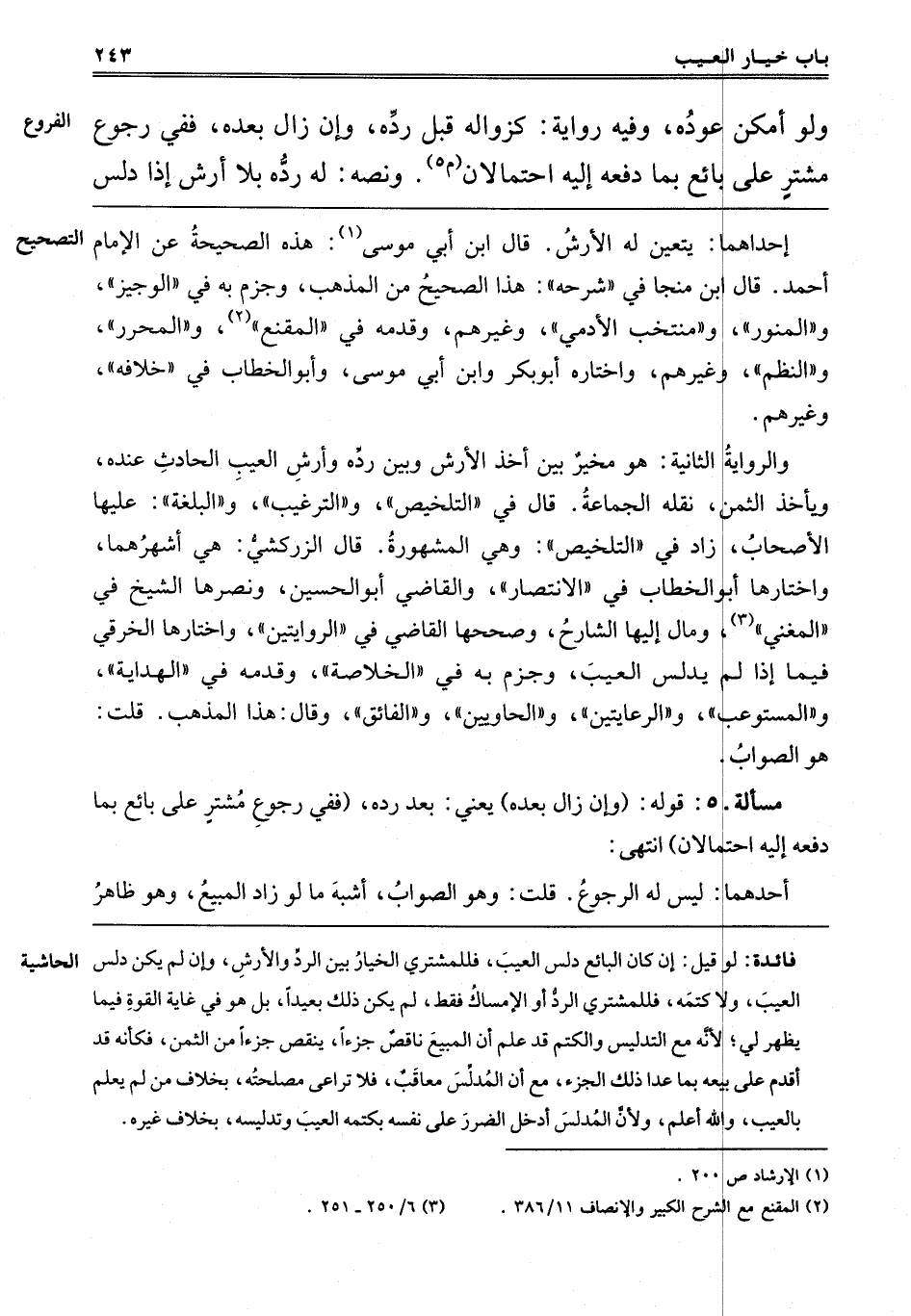 وَالرِّوَايَةُ الثَّانِيَةُ" هُوَ مُخَيَّرٌ بَيْنَ أَخْذِ الْأَرْشِ وَبَيْنَ رَدِّهِ وَأَرْشِ الْعَيْبِ الْحَادِثِ عِنْدَهُ وَيَأْخُذُ الثَّمَنَ, نَقَلَهُ الْجَمَاعَةُ, قَالَ فِي التَّلْخِيصِ وَالتَّرْغِيبِ: عَلَيْهَا الْأَصْحَابُ, زَادَ فِي التَّلْخِيصِ: وَهِيَ الْمَشْهُورَةُ, قَالَ الزَّرْكَشِيّ: هِيَ أَشْهَرُهُمَا, وَاخْتَارَهَا أَبُو الْخَطَّابِ فِي الِانْتِصَارِ وَالْقَاضِي أَبُو الْحُسَيْنِ, وَنَصَرَهَا الشَّيْخُ فِي الْمُغْنِي3, وَمَالَ إلَيْهَا الشَّارِحُ وَصَحَّحَهَا الْقَاضِي فِي الرِّوَايَتَيْنِ, وَاخْتَارَهَا الْخِرَقِيُّ فِيمَا إذَا لَمْ يُدَلَّسْ الْعَيْبُ, وَجَزَمَ بِهِ فِي الْخُلَاصَةِ, وَقَدَّمَهُ فِي الْهِدَايَةِ وَالْمُسْتَوْعِبِ وَالرِّعَايَتَيْنِ وَالْحَاوِي وَالْفَائِقِ وَقَالَ: هَذَا الْمَذْهَبُ "قُلْت": وَهُوَ الصَّوَابُ