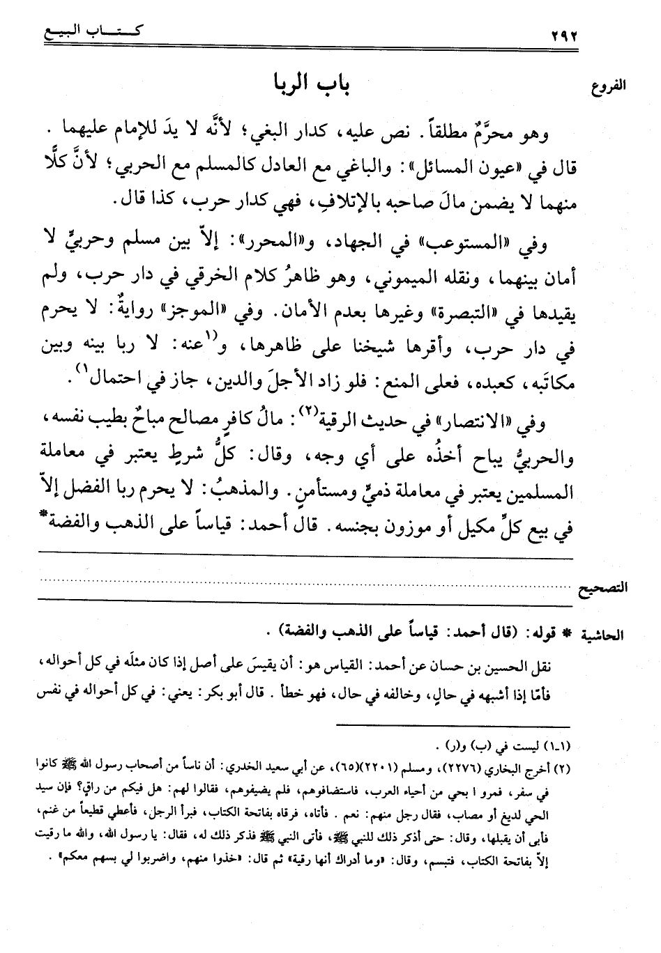 وَفِي الِانْتِصَارِ فِي حَدِيثِ الرَّقَبَةِ2: مَالُ كَافِرٍ مُصَالَحٍ مُبَاحٌ بِطِيبِ نَفْسِهِ, وَالْحَرْبِيُّ يُبَاحُ أَخْذُهُ عَلَى أَيِّ وَجْهٍ, وَقَالَ: كُلُّ شَرْطٍ يُعْتَبَرُ فِي مُعَامَلَةِ الْمُسْلِمِينَ يُعْتَبَرُ فِي مُعَامَلَةِ ذِمِّيٍّ وَمُسْتَأْمَنٍ, وَالْمَذْهَبُ: لَا يَحْرُمُ رِبَا الْفَضْلِ إلَّا فِي بَيْعِ كُلِّ مَكِيلٍ أَوْ مَوْزُونٍ بِجِنْسِهِ, قَالَ أَحْمَدُ: قِيَاسًا عَلَى الذَّهَبِ وَالْفِضَّةِ