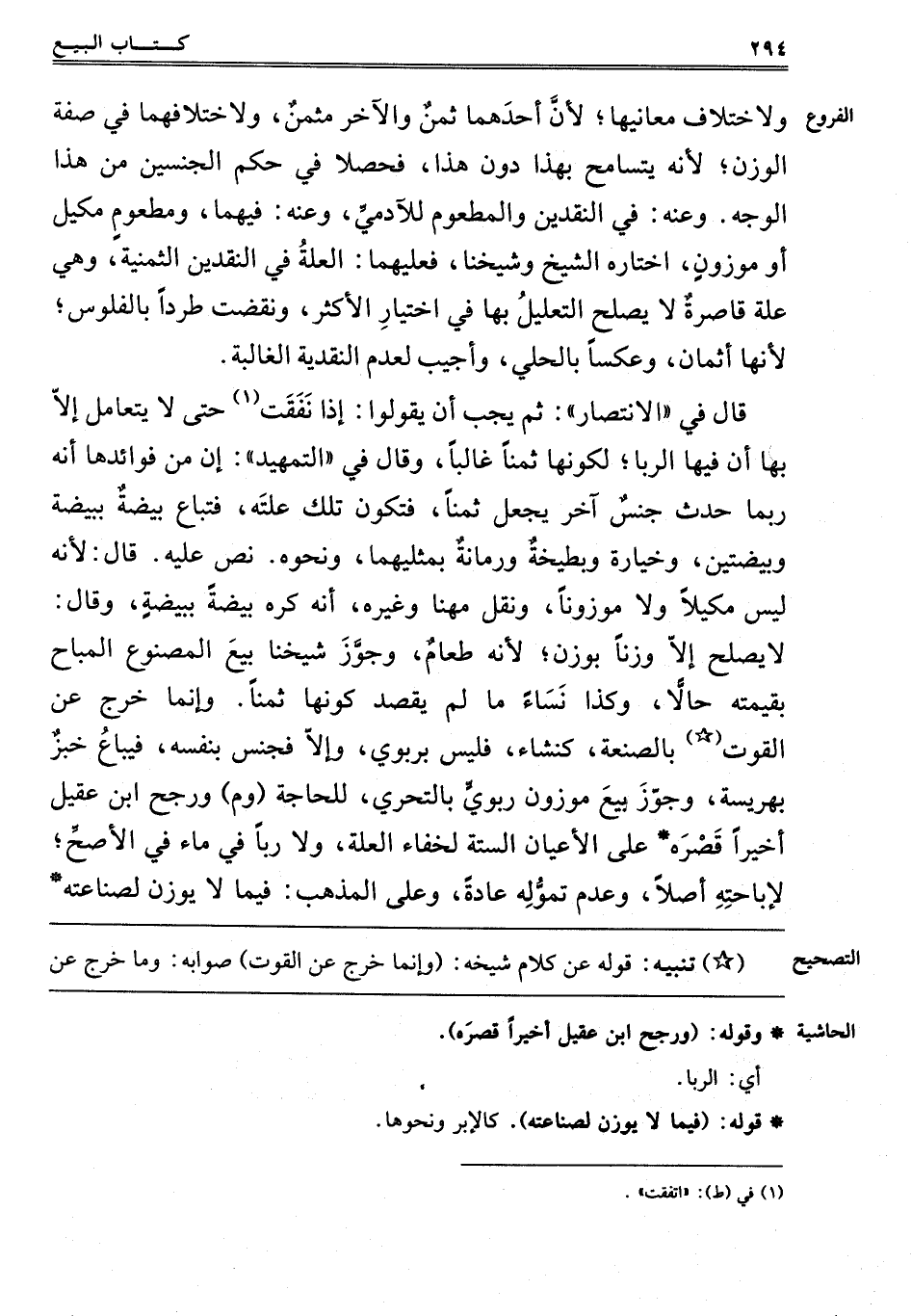 قَالَ فِي الِانْتِصَارِ: ثُمَّ يَجِبُ أَنْ يَقُولُوا إذا نفقت1 حَتَّى لَا يُتَعَامَلَ إلَّا بِهَا أَنَّ فِيهَا الرِّبَا, لِكَوْنِهَا ثَمَنًا غَالِبًا. وَقَالَ فِي التَّمْهِيدِ: إنَّ مِنْ فَوَائِدِهَا أَنَّهُ رُبَّمَا حَدَثَ جِنْسٌ آخَرُ يُجْعَلُ ثَمَنًا, فَتَكُونُ تِلْكَ عِلَّتَهُ, فَتُبَاعُ بَيْضَةٌ بِبَيْضَةٍ وَبِبَيْضَتَيْنِ, وَخِيَارَةٌ وَبِطِّيخَةٌ وَرُمَّانَةٌ بِمِثْلِهَا, وَنَحْوُهُ, نَصَّ عَلَيْهِ, قَالَ: لِأَنَّهُ لَيْسَ مَكِيلًا وَلَا مَوْزُونًا, وَنَقَلَ مُهَنَّا وَغَيْرُهُ أَنَّهُ كَرِهَ بَيْضَةً بِبَيْضَةٍ وَقَالَ: لَا يَصْلُحُ إلَّا وَزْنًا بِوَزْنٍ, لِأَنَّهُ طَعَامٌ, وَجَوَّزَ شَيْخُنَا بَيْعَ الْمَصُوغِ الْمُبَاحِ بِقِيمَتِهِ حَالًّا, وَكَذَا نِسَاءٌ مَا لَمْ يَقْصِدْ كَوْنَهَا ثَمَنًا. وَمَا خَرَجَ عَنْ الْقُوتِ "*" بِالصَّنْعَةِ كَنَشًا فَلَيْسَ بِرِبَوِيٍّ, وَإِلَّا فَجِنْسٌ بِنَفْسِهِ, فَيُبَاعُ خُبْزٌ بِهَرِيسَةٍ, وَجَوَّزَ بَيْعَ مَوْزُونٍ رِبَوِيٍّ بالتحري, للحاجة "وم" وَرَجَّحَ ابْنُ عَقِيلٍ أَخِيرًا قَصْرَهُ عَلَى الْأَعْيَانِ السِّتَّةِ, لِخَفَاءِ الْعِلَّةِ. وَلَا رِبَا فِي مَاءٍ, فِي الْأَصَحِّ, لِإِبَاحَتِهِ أَصْلًا, وَعَدَمِ تَمَوُّلِهِ عَادَةً, وعلى المذهب فيما لا يوزن لصناعة