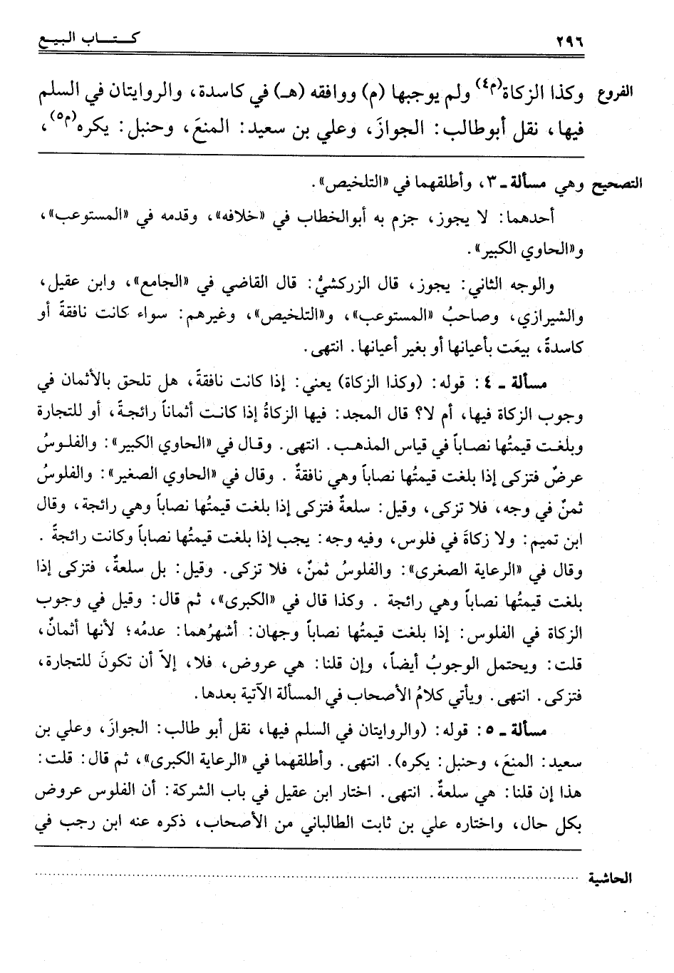 "مَسْأَلَةٌ 4" قَوْلُهُ: وَكَذَا الزَّكَاةُ. يَعْنِي إذَا كَانَتْ نَافِقَةً هَلْ تَلْحَقُ بِالْأَثْمَانِ فِي وُجُوبِ الزَّكَاةِ فِيهَا أَمْ لَا؟ قَالَ الْمَجْدُ: فِيهَا الزَّكَاةُ إذَا كَانَتْ أَثْمَانًا رَائِجَةً, أَوْ لِلتِّجَارَةِ وَبَلَغَتْ قِيمَتُهَا نِصَابًا, فِي قِيَاسِ الْمَذْهَبِ, انْتَهَى. وَقَالَ فِي الْحَاوِي الْكَبِيرِ: وَالْفُلُوسُ عَرَضٌ فَتُزَكَّى إذَا بَلَغَتْ قِيمَتُهَا نِصَابًا وَهِيَ نَافِقَةٌ. وَقَالَ فِي الْحَاوِي الصَّغِيرِ: وَالْفُلُوسُ ثَمَنٌ فِي وَجْهٍ فَلَا تُزَكَّى, وَقِيلَ: سِلْعَةٌ فَتُزَكَّى إذَا بَلَغَتْ قِيمَتُهَا نِصَابًا وَهِيَ رَائِجَةٌ. وَقَالَ ابْنُ تَمِيمٍ: وَلَا زَكَاةَ فِي فُلُوسٍ, وَفِيهِ وَجْهٌ يَجِبُ إذَا بَلَغَتْ قِيمَتُهَا نِصَابًا وَكَانَتْ رَائِجَةً. وَقَالَ فِي الرِّعَايَةِ الصُّغْرَى: وَالْفُلُوسُ ثَمَنٌ فَلَا تُزَكَّى. وَقِيلَ: بَلْ سِلْعَةٌ فَتُزَكَّى إذَا بَلَغَتْ قِيمَتُهَا نِصَابًا وَهِيَ رَائِجَةٌ. وَكَذَا قَالَ فِي الْكُبْرَى ثُمَّ قَالَ: وَقِيلَ فِي وُجُوبِ الزَّكَاةِ فِي الْفُلُوسِ إذَا بَلَغَتْ قِيمَتُهَا نِصَابًا وَجْهَانِ أَشْهَرُهُمَا عَدَمُهُ لِأَنَّهُمَا أَثْمَانٌ "قُلْت": وَيُحْتَمَلُ الْوُجُوبُ أَيْضًا, وَإِنْ قُلْنَا هِيَ عَرُوضٌ فَلَا إلَّا أَنْ تَكُونَ لِلتِّجَارَةِ فَلَا تُزَكَّى, انْتَهَى, وَيَأْتِي كَلَامُ الْأَصْحَابِ فِي الْمَسْأَلَةِ الْآتِيَةِ بَعْدَهَا.