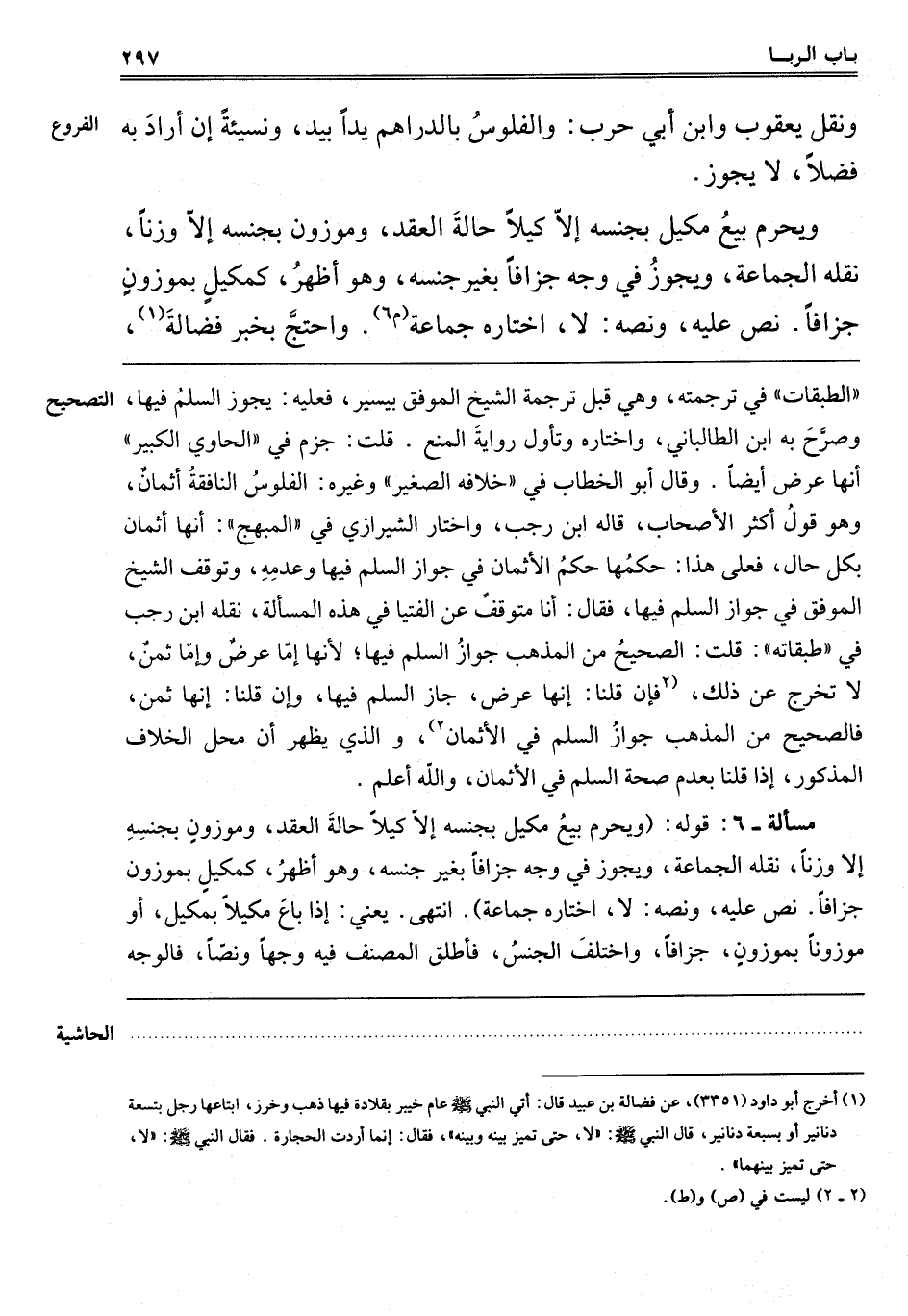 ـــــــــــــــــــــــــــــQالطَّبَقَاتِ فِي تَرْجَمَتِهِ, وَهِيَ قَبْلَ تَرْجَمَةِ الشَّيْخِ الْمُوَفَّقِ بِيَسِيرٍ, فَعَلَيْهِ يَجُوزُ السَّلَمُ فِيهَا, وَصَرَّحَ بِهِ ابْنُ الطَّالِبَانِيِّ, وَاخْتَارَهُ وَتَأَوَّلَ رِوَايَةَ الْمَنْعِ "قُلْت": جَزَمَ فِي الْحَاوِي الْكَبِيرِ أَنَّهَا عَرَضٌ أَيْضًا. وَقَالَ أَبُو الْخَطَّابِ فِي خِلَافِهِ الصَّغِيرِ وَغَيْرِهِ: الْفُلُوسُ النَّافِقَةُ أَثْمَانٌ, وَهُوَ قَوْلُ أَكْثَرِ الْأَصْحَابِ, قَالَهُ ابْنُ رَجَبٍ, وَاخْتَارَهُ الشِّيرَازِيُّ فِي الْمُبْهِجِ أَنَّهَا أَثْمَانٌ بِكُلِّ حَالٍ, فَعَلَى هَذَا حُكْمُهَا حُكْمُ الْأَثْمَانِ فِي جَوَازِ السَّلَمِ فِيهَا وَعَدَمِهِ, وَتَوَقَّفَ الشَّيْخُ الْمُوَفَّقُ فِي جَوَازِ السَّلَمِ فِيهَا فَقَالَ: أَنَا مُتَوَقِّفٌ عَنْ الْفُتْيَا فِي هَذِهِ الْمَسْأَلَةِ, نَقَلَهُ ابْنُ رَجَبٍ فِي طَبَقَاتِهِ "قُلْت": الصَّحِيحُ مِنْ الْمَذْهَبِ جَوَازُ السَّلَمِ فِيهَا, لِأَنَّهَا إمَّا عَرَضٌ وَإِمَّا ثَمَنٌ, لَا تَخْرُجُ عن ذلك. "2فإن قلنا: إنها عرض جاز السلم فيها وإن قلنا إنها ثمن فالصحيح من المذهب جواز السلم في الأثمان2", وَاَلَّذِي يَظْهَرُ أَنَّ مَحَلَّ الْخِلَافِ الْمَذْكُورِ إذَا قُلْنَا بِعَدَمِ صِحَّةِ السَّلَمِ فِي الْأَثْمَانِ, وَاَللَّهُ أَعْلَمُ.