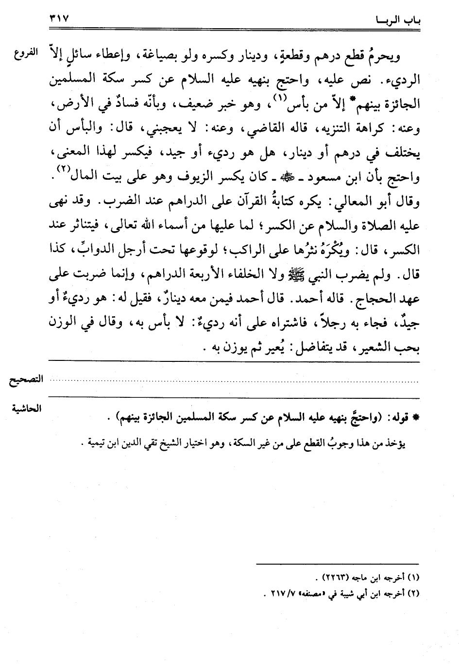 وَيَحْرُمُ قَطْعُ دِرْهَمٍ وَقِطْعَةٍ وَدِينَارٍ وَكَسْرُهُ وَلَوْ بِصِيَاغَةٍ, وَإِعْطَاءُ سَائِلٍ إلَّا الرَّدِيءَ, نَصَّ عَلَيْهِ. وَاحْتَجَّ بِنَهْيِهِ عَلَيْهِ السَّلَامُ عَنْ كَسْرِ سِكَّةِ الْمُسْلِمِينَ الْجَائِزَةِ بَيْنَهُمْ إلَّا مِنْ بَأْسٍ1, وَهُوَ خَبَرٌ ضَعِيفٌ, وَبِأَنَّهُ فَسَادٌ فِي الْأَرْضِ, وَعَنْهُ: كَرَاهَةُ التَّنْزِيَةِ, قَالَهُ الْقَاضِي, وَعَنْهُ: لَا يُعْجِبُنِي, قَالَ: وَالْبَأْسُ أَنْ يُخْتَلَفَ فِي دِرْهَمٍ أَوْ دِينَارٍ هَلْ هُوَ رَدِيءٌ أَوْ جَيِّدٌ فَيُكْسَرُ لِهَذَا الْمَعْنَى, وَاحْتَجَّ بِأَنَّ ابْنَ مَسْعُودٍ رَضِيَ اللَّهُ عَنْهُ كَانَ يَكْسِرُ الزُّيُوفَ وَهُوَ عَلَى بَيْتِ الْمَالِ2. وَقَالَ أَبُو الْمَعَالِي: يُكْرَهُ كِتَابَةُ الْقُرْآنِ عَلَى الدَّرَاهِمِ عِنْدَ الضَّرْبِ. وَقَدْ نَهَى عَلَيْهِ الصَّلَاةُ وَالسَّلَامُ عَنْ الْكَسْرِ, لِمَا عَلَيْهَا مِنْ أَسْمَاءِ اللَّهِ تَعَالَى, فَيَتَنَاثَرُ عِنْدَ الْكَسْرِ, قَالَ: وَيُكْرَهُ نَثْرُهَا عَلَى الرَّاكِبِ, لِوُقُوعِهَا تَحْتَ أَرْجُلِ الدَّوَابِّ, كَذَلِكَ قَالَ: وَلَمْ يَضْرِبْ النَّبِيُّ صَلَّى اللَّهُ عَلَيْهِ وَسَلَّمَ وَلَا الْخُلَفَاءُ الْأَرْبَعَةُ الدَّرَاهِمَ وَإِنَّمَا ضُرِبَتْ عَلَى عَهْدِ الْحَجَّاجِ, قَالَهُ أَحْمَدُ. قَالَ أَحْمَدُ فِيمَنْ مَعَهُ دِينَارٌ, فَقِيلَ لَهُ: هُوَ رَدِيءٌ أَوْ جَيِّدٌ, فَجَاءَ بِهِ رَجُلًا فَاشْتَرَاهُ عَلَى أَنَّهُ رَدِيءٌ: لَا بَأْسَ بِهِ وَقَالَ فِي الْوَزْنِ بِحَبِّ الشَّعِيرِ, قَدْ يتفاضل: يعير ثم يوزن به.
