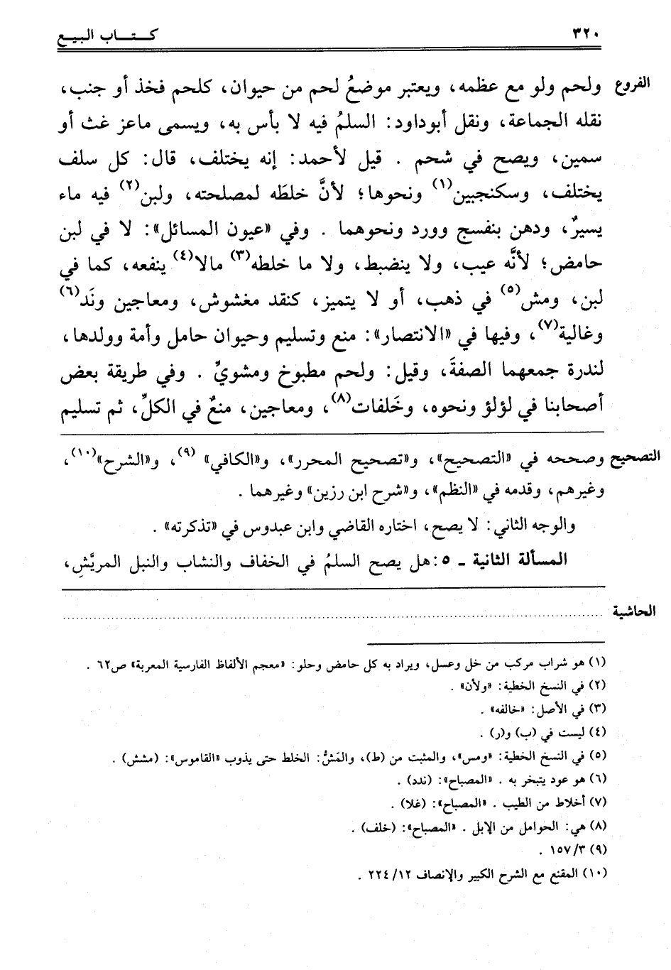 وَلَحْمٍ وَلَوْ مَعَ عَظْمِهِ, وَيُعْتَبَرُ مَوْضِعُ لَحْمٍ مِنْ الْحَيَوَانِ كَلَحْمِ فَخْذٍ أَوْ جَنْبٍ, نَقَلَهُ الْجَمَاعَةُ. وَنَقَلَ أَبُو دَاوُد: السَّلَمُ فِيهِ لَا بَأْسَ بِهِ, وَيُسَمَّى مَاعِزٌ غَثٌّ أَوْ سَمِينٌ. وَيَصِحُّ فِي شَحْمٍ, قِيلَ لِأَحْمَدَ: إنَّهُ يَخْتَلِفُ, قَالَ: كُلُّ سَلَفٍ يَخْتَلِفُ, وَسَكَنْجَبِينٍ1 وَنَحْوِهَا, لِأَنَّ خَلْطَهُ لِمَصْلَحَتِهِ, وَلَبَنٍ2 فِيهِ مَاءٌ يَسِيرٌ وَدُهْنِ بَنَفْسَجٍ وَوَرْدٍ وَنَحْوِهَا. وَفِي عُيُونِ الْمَسَائِلِ: لَا فِي لَبَنٍ حَامِضٍ, لِأَنَّهُ عَيْبٌ وَلَا يَنْضَبِطُ, ولا ما خلطه3 مالا4 ينفعه كَمَا فِي لَبَنٍ وَمِشٍّ5 فِي ذَهَبٍ, أَوْ لَا يَتَمَيَّزُ كَنَقْدٍ مَغْشُوشٍ وَمَعَاجِينَ وَنَدٍّ6 وَغَالِيَةٍ7, وَفِيهَا فِي الِانْتِصَارِ مَنْعٌ وَتَسْلِيمٌ, وَحَيَوَانٍ حَامِلٍ وَأَمَةٍ وَوَلَدِهَا, لِنُدْرَةِ جَمْعِهِمَا الصِّفَةَ, وَقِيلَ: وَلَحْمٍ مَطْبُوخٍ وَمَشْوِيٍّ. وَفِي طَرِيقَةِ بَعْضِ أَصْحَابِنَا فِي لُؤْلُؤٍ وَنَحْوِهِ وَخَلِفَاتٍ8 وَمَعَاجِينَ مَنْعٌ فِي الْكُلِّ, ثم تسليم