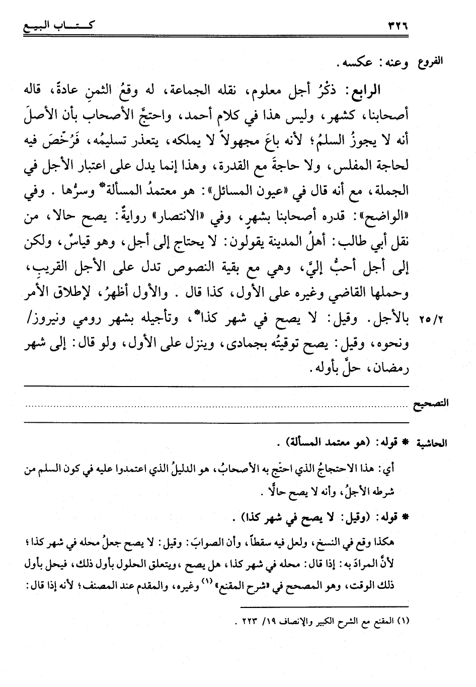 "الرَّابِعُ" ذِكْرُ أَجَلٍ مَعْلُومٍ. نَقَلَهُ الْجَمَاعَةُ لَهُ وَقَعَ فِي الثَّمَنِ عَادَةً, قَالَهُ أَصْحَابُنَا كَشَهْرٍ, وَلَيْسَ هَذَا فِي كَلَامِ أَحْمَدَ, وَاحْتَجَّ الْأَصْحَابُ بِأَنَّ الْأَصْلَ أَنَّهُ لَا يَجُوزُ السَّلَمُ, لِأَنَّهُ بَاعَ مَجْهُولًا لَا يَمْلِكُهُ يَتَعَذَّرُ تَسْلِيمُهُ, فَرَخَّصَ فِيهِ لِحَاجَةِ الْمُفْلِسِ, وَلَا حَاجَةَ مَعَ الْقُدْرَةِ, وَهَذَا إنَّمَا يَدُلُّ عَلَى اعْتِبَارِ الْأَجَلِ فِي الْجُمْلَةِ, مَعَ أَنَّهُ قَالَ فِي عُيُونِ الْمَسَائِلِ: هُوَ مُعْتَمَدُ الْمَسْأَلَةِ وَسِرُّهَا. وَفِي الْوَاضِحِ: قَدَّرَهُ أَصْحَابُنَا بِشَهْرٍ. وَفِي الِانْتِصَارِ رِوَايَةٌ: يَصِحُّ حَالًّا, مِنْ نَقْلِ أَبِي طَالِبٍ: أَهْلُ الْمَدِينَةِ يَقُولُونَ: لَا يَحْتَاجُ إلَى أَجَلٍ, وَهُوَ قِيَاسٌ, وَلَكِنْ إلَى أَجَلٍ أَحَبُّ إلَيَّ, وَهِيَ مَعَ بَقِيَّةِ النُّصُوصِ تَدُلُّ عَلَى الْأَجَلِ الْقَرِيبِ. وَحَمَلَهَا الْقَاضِي وَغَيْرُهُ عَلَى الْأَوَّلِ, كَذَا قَالَ. وَالْأَوَّلُ أَظْهَرُ, لِإِطْلَاقِ الْأَمْرِ بِالْأَجَلِ. وَقِيلَ: لَا يَصِحُّ فِي شَهْرِ كَذَا وَتَأْجِيلُهُ بِشَهْرٍ رُومِيٍّ وَنَيْرُوزَ وَنَحْوِهِ, وَقِيلَ: يَصِحُّ تَوْقِيتُهُ بِجُمَادَى, وَيَنْزِلُ عَلَى الْأَوَّلِ, وَلَوْ قَالَ: إلَى شَهْرِ رَمَضَانَ, حل بأوله.
