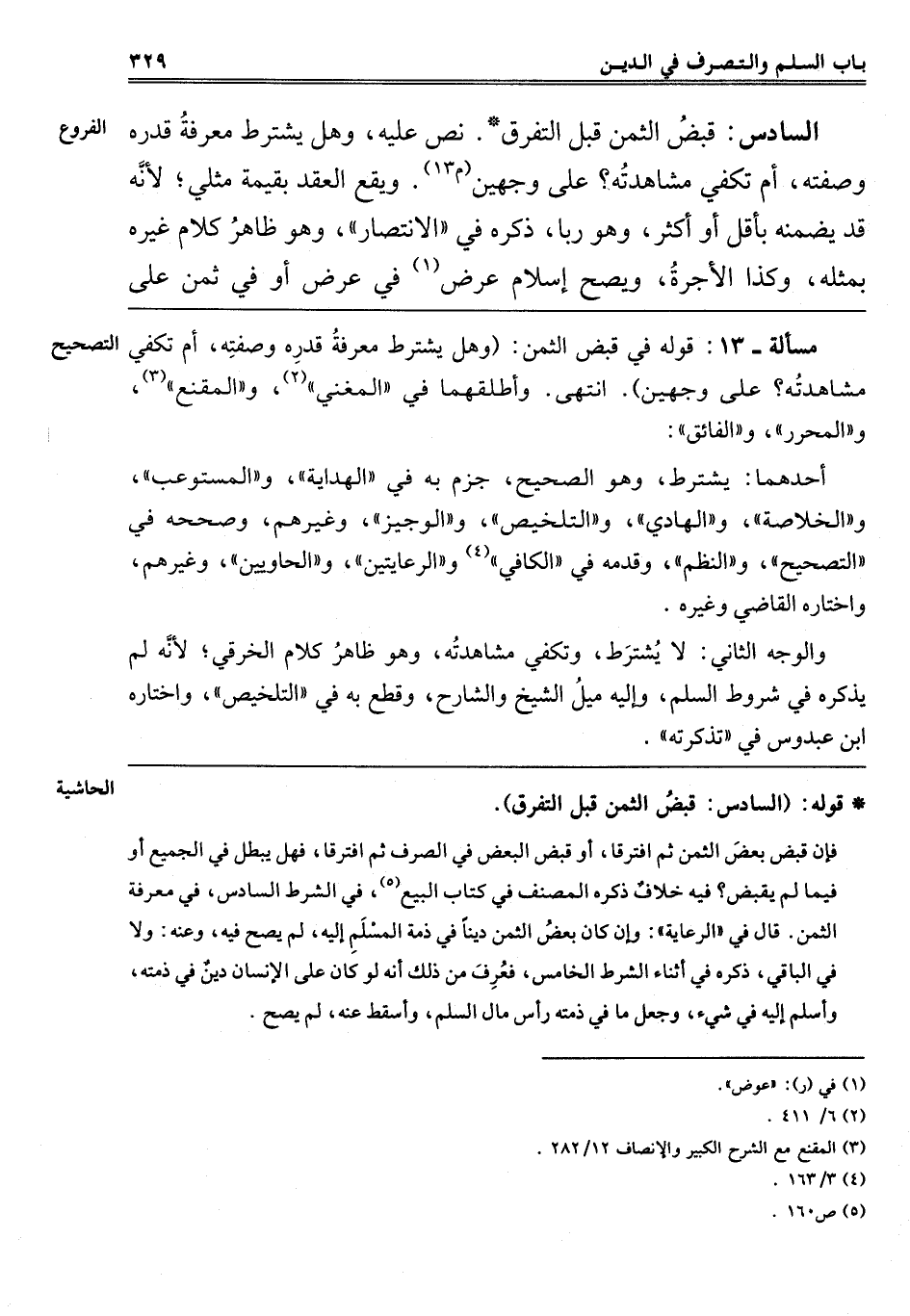 "السَّادِسُ" قَبْضُ الثَّمَنِ قَبْلَ التَّفَرُّقِ, نَصَّ عَلَيْهِ, وهل يشترط معرفة قدره وصفته أم تَكْفِي مُشَاهَدَتُهُ؟ عَلَى وَجْهَيْنِ "م 13" وَيَقَعُ الْعَقْدُ بِقِيمَةِ مِثْلِيٍّ, لِأَنَّهُ قَدْ يَضْمَنُهُ بِأَقَلَّ أَوْ أَكْثَرَ, وَهُوَ رِبًا, ذَكَرَهُ فِي الِانْتِصَارِ وهُوَ ظَاهِرُ كَلَامِ غَيْرِهِ بِمِثْلِهِ, وَكَذَا الْأُجْرَةُ. وَيَصِحُّ إسْلَامُ عَرَضٍ1 فِي عَرَضٍ أَوْ فِي ثمن, على