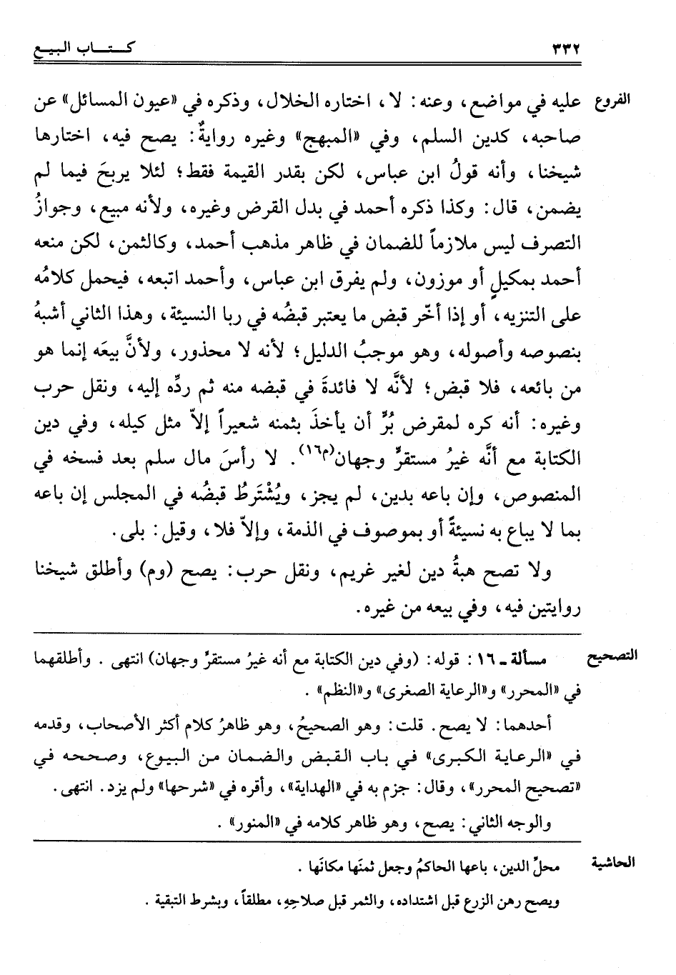 عَلَيْهِ فِي مَوَاضِعَ, وَعَنْهُ: لَا, اخْتَارَهُ الْخَلَّالُ, وَذَكَرَهُ فِي عُيُونِ الْمَسَائِلِ عَنْ صَاحِبِهِ, كَدَيْنِ السَّلَمِ. وَفِي الْمُبْهِجِ وَغَيْرِهِ رِوَايَةٌ: يَصِحُّ فِيهِ, اخْتَارَهَا شَيْخُنَا وَأَنَّهُ قَوْلُ ابْنِ عَبَّاسٍ, لَكِنْ بِقَدْرِ الْقِيمَةِ فَقَطْ لِئَلَّا يَرْبَحَ فِيمَا لَمْ يَضْمَنْ, قَالَ: وَكَذَا ذَكَرَهُ أَحْمَدُ فِي بَدَلِ الْقَرْضِ وَغَيْرِهِ, وَلِأَنَّهُ مَبِيعٌ, وَجَوَازُ التَّصَرُّفِ لَيْسَ مُلَازِمًا لِلضَّمَانِ, فِي ظَاهِرِ مَذْهَبِ أَحْمَدَ, وَكَالثَّمَنِ, لَكِنْ مَنَعَهُ أَحْمَدُ بِمَكِيلٍ أَوْ مَوْزُونٍ, وَلَمْ يُفَرِّقْ ابْنُ عَبَّاسٍ, وَأَحْمَدُ تَبِعَهُ فَيُحْمَلُ كَلَامُهُ عَلَى التَّنْزِيهِ أَوْ إذَا أَخَّرَ قَبَضَ مَا يُعْتَبَرُ قَبْضُهُ فِي رِبَا النَّسِيئَةِ, وَهَذَا الثَّانِي أَشْبَهُ بِنُصُوصِهِ وَأُصُولِهِ, وَهُوَ مُوجَبُ الدَّلِيلِ, لِأَنَّهُ لَا مَحْذُورَ, وَلِأَنَّ بَيْعَهُ إنَّمَا هُوَ مِنْ بَائِعِهِ, فَلَا قَبْضَ, لِأَنَّهُ لَا فَائِدَةَ فِي قَبْضِهِ مِنْهُ ثُمَّ رَدِّهِ إلَيْهِ, وَنَقَلَ حَرْبٌ وَغَيْرُهُ: أَنَّهُ كَرِهَ لِمُقْرِضِ بُرٍّ أَنْ يَأْخُذَ بِثَمَنِهِ شَعِيرًا إلَّا مِثْلَ كَيْلِهِ. وَفِي دَيْنِ الْكِتَابَةِ مَعَ أَنَّهُ غَيْرُ مُسْتَقِرٍّ وَجْهَانِ "م 16" لَا رَأْسَ مَالِ سَلَمٍ بَعْدَ فَسْخِهِ, فِي الْمَنْصُوصِ, وَإِنْ بَاعَهُ بِدَيْنٍ لَمْ يَجُزْ, وَيُشْتَرَطُ قَبْضُهُ فِي الْمَجْلِسِ إنْ بَاعَهُ بِمَا لَا يُبَاعُ بِهِ نَسِيئَةً أَوْ بِمَوْصُوفٍ فِي الذِّمَّةِ, وَإِلَّا فَلَا, وَقِيلَ: بَلَى.