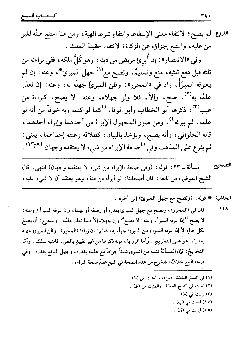 ـــــــــــــــــــــــــــــQ"مَسْأَلَةٌ 23" قَوْلُهُ: وَفِي صِحَّةِ الْإِبْرَاءِ مِنْ شَيْءٍ لَا يَعْتَقِدُهُ وَجْهَانِ, انْتَهَى. قَالَ الشَّيْخُ الْمُوَفَّقُ وَمَنْ تَابَعَهُ: قَالَ أَصْحَابُنَا: لَوْ أَبْرَأَهُ مِنْ مِائَةٍ وَهُوَ يَعْتَقِدُ أَنْ لَا شَيْءَ عَلَيْهِ