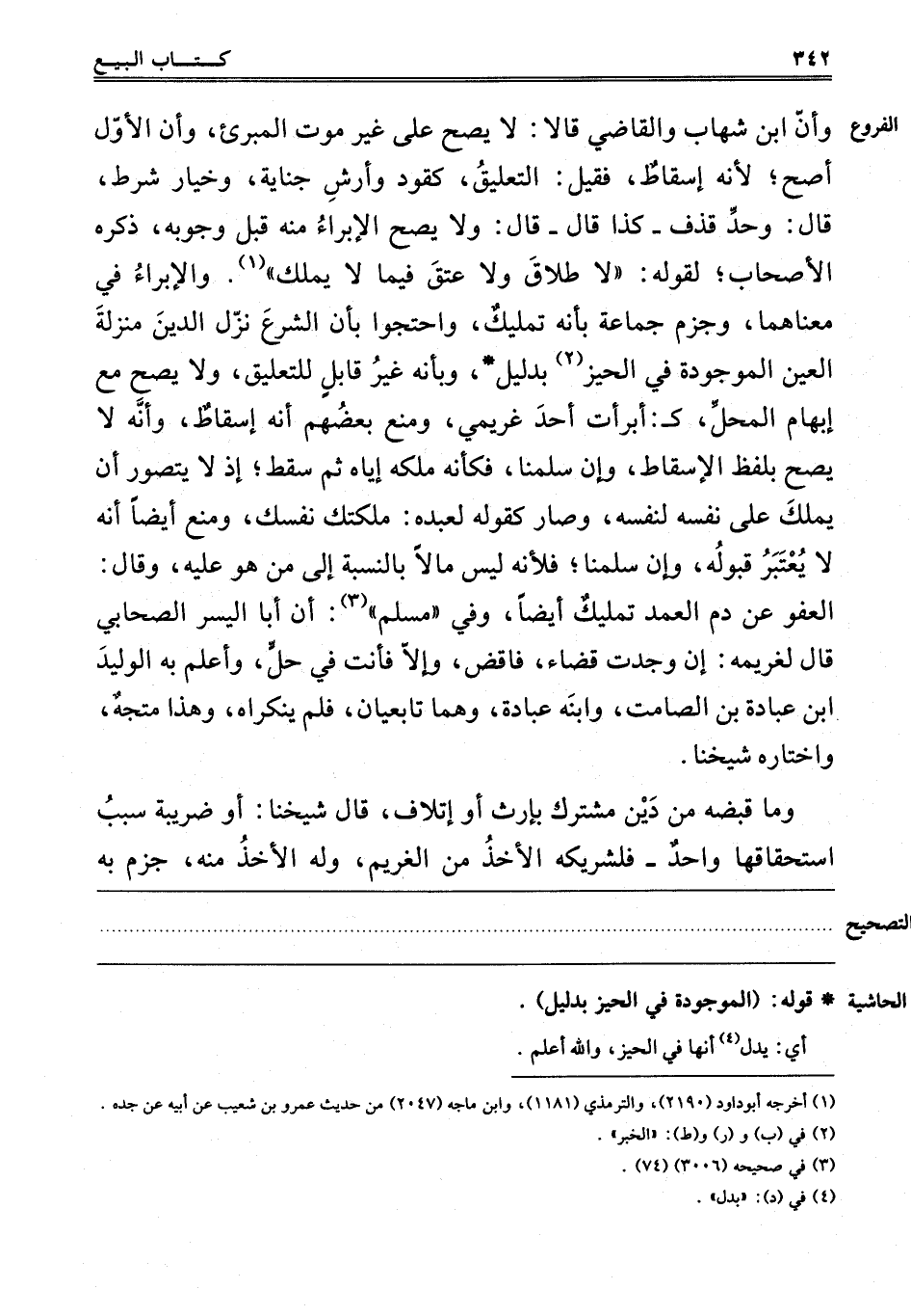 وَأَنَّ ابْنَ شِهَابٍ وَالْقَاضِيَ قَالَا: لَا يَصِحُّ عَلَى غَيْرِ مَوْتِ الْمُبْرِئِ, وَأَنَّ الْأَوَّلَ أَصَحُّ, لِأَنَّهُ إسْقَاطٌ, فَقِيلَ: التَّعْلِيقُ كَقَوَدٍ وَأَرْشِ جِنَايَةٍ وَخِيَارِ شَرْطٍ, قَالَ: وَحَدِّ قَذْفٍ كَذَا قَالَ: قَالَ وَلَا يَصِحُّ الْإِبْرَاءُ مِنْهُ, قَبْلَ وُجُوبِهِ, ذَكَرَهُ الْأَصْحَابُ, لِقَوْلِهِ: لَا طَلَاقَ وَلَا عِتْقَ فِيمَا لَا يُمْلَكُ1. وَالْإِبْرَاءُ فِي مَعْنَاهُمَا, وَجَزَمَ جَمَاعَةٌ بِأَنَّهُ تَمْلِيكٌ, وَاحْتَجُّوا بِأَنَّ الشَّرْعَ نَزَّلَ الدين منزلة العين الموجودة في الحيز2 بِدَلِيلٍ, وَبِأَنَّهُ غَيْرُ قَابِلٍ لِلتَّعْلِيقِ. وَلَا يَصِحُّ مَعَ إبْهَامِ الْمَحِلِّ كَأَبْرَأْت أَحَدَ غَرِيمَيَّ, وَمَنَعَ بَعْضُهُمْ أَنَّهُ إسْقَاطٌ. وَأَنَّهُ لَا يَصِحُّ بِلَفْظِ الْإِسْقَاطِ, وَإِنْ سَلَّمْنَا فَكَأَنَّهُ مَلَّكَهُ إيَّاهُ ثُمَّ سَقَطَ, إذْ لَا يُتَصَوَّرُ أَنْ يَمْلِكَ عَلَى نَفْسِهِ لِنَفْسِهِ, وَصَارَ كَقَوْلِهِ لِعَبْدِهِ: مَلَّكْتُك نَفْسَك, وَمَنَعَ أَيْضًا أَنَّهُ لَا يُعْتَبَرُ قَبُولُهُ, وَإِنْ سَلَّمْنَا فَلِأَنَّهُ لَيْسَ مَالًا بِالنِّسْبَةِ إلَى مَنْ هُوَ عَلَيْهِ, وَقَالَ: الْعَفْوُ عَنْ دَمِ الْعَمْدِ تَمْلِيكٌ أَيْضًا. وَفِي مُسْلِمٍ3 أَنَّ أَبَا الْيُسْرِ الصَّحَابِيَّ قَالَ لِغَرِيمِهِ: إنْ وَجَدْت قَضَاءً فَاقْضِ وَإِلَّا فَأَنْتَ فِي حِلٍّ, وَأَعْلَمَ بِهِ الْوَلِيدَ بْنَ عُبَادَةَ بْنِ الصَّامِتِ وَابْنَهُ عُبَادَةَ وَهُمَا تَابِعِيَّانِ فَلَمْ يُنْكِرَاهُ وَهَذَا مُتَّجِهٌ, وَاخْتَارَهُ شَيْخُنَا.
