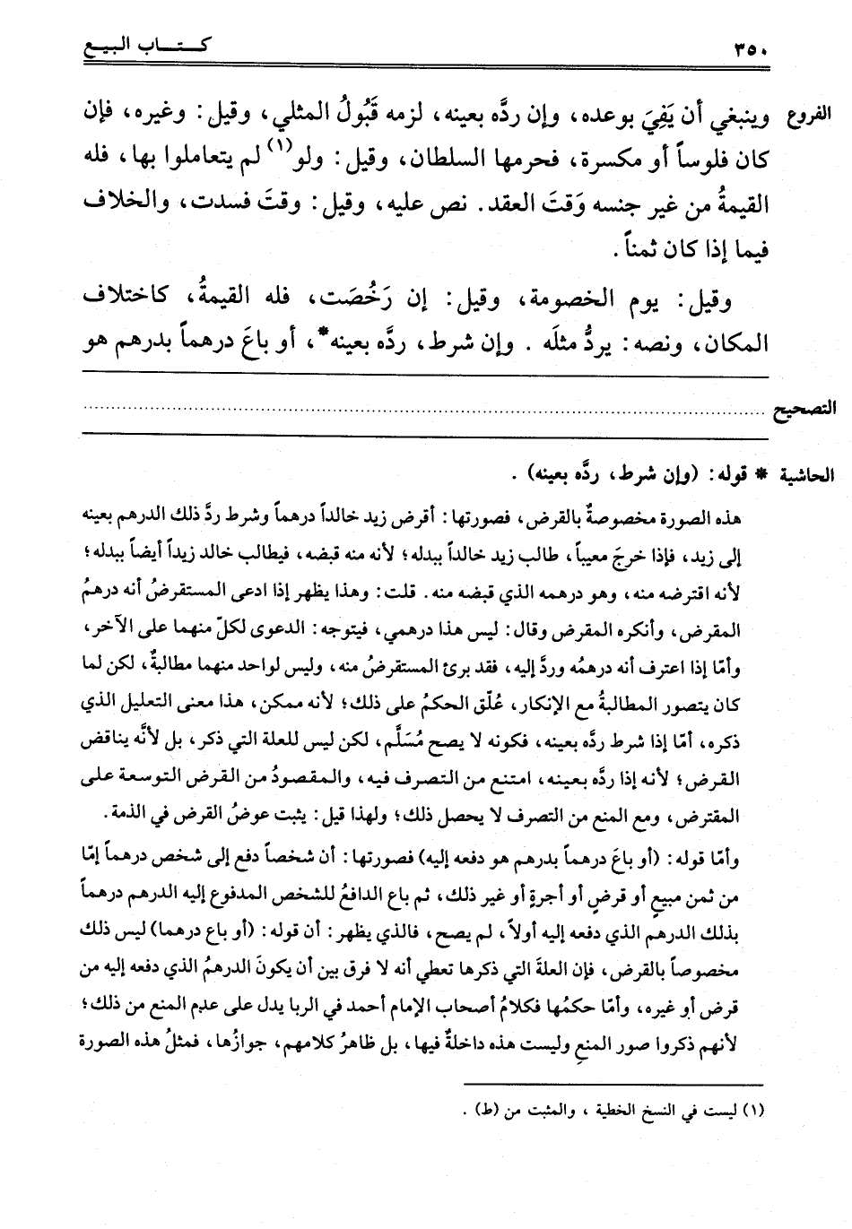وَقِيلَ: يَوْمَ الْخُصُومَةِ, وَقِيلَ: إنْ رَخُصَتْ فَلَهُ الْقِيمَةُ, كَاخْتِلَافِ الْمَكَانِ, وَنَصُّهُ: يَرُدُّ مِثْلَهُ, وَإِنْ شَرَطَ رَدَّهُ بِعَيْنِهِ أَوْ بَاعَ دِرْهَمًا بِدِرْهَمٍ هو
