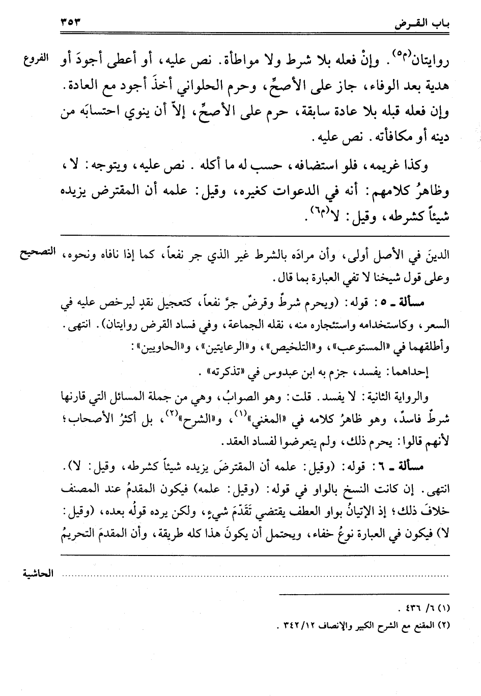 "مَسْأَلَةٌ 6" قَوْلُهُ: وَقِيلَ عِلْمُهُ أَنَّ الْمُقْتَرِضَ يَزِيدُهُ شَيْئًا كَشَرْطِهِ وَقِيلَ: لَا, انْتَهَى إنْ كَانَتْ النُّسَخُ بِالْوَاوِ فِي قَوْلِهِ, وَقِيلَ عِلْمُهُ, فَيَكُونُ الْمُقَدَّمُ عِنْدَ الْمُصَنِّفِ خِلَافُ ذَلِكَ, إذْ الْإِتْيَانُ بِوَاوٍ يَقْتَضِي تَقَدُّمَ شَيْءٍ, وَلَكِنْ يَرُدُّهُ قَوْلُهُ بَعْدَهُ, وَقِيلَ: لَا. فَيَكُونُ فِي الْعِبَارَةِ نَوْعُ خَفَاءٍ, وَيَحْتَمِلُ أَنْ يَكُونَ هَذَا كُلُّهُ طَرِيقَةً, وأن المقدم التحريم