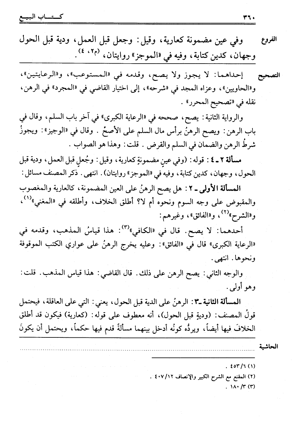 "الْمَسْأَلَةُ الثَّانِيَةُ 3" الرَّهْنُ عَلَى الدِّيَةِ قَبْلَ الْحَوْلِ, يَعْنِي الَّتِي عَلَى الْعَاقِلَةِ فَيَحْتَمِلُ قَوْلُ الْمُصَنِّفِ وَدِيَةٌ قَبْلَ الْحَوْلِ, أَنَّهُ مَعْطُوفٌ عَلَى قَوْلِهِ "كَعَارِيَّةٍ" فَيَكُونُ قَدْ أَطْلَقَ الْخِلَافَ فِيهَا أَيْضًا, وَيَرُدُّهُ كَوْنُهُ أَدْخَلَ بَيْنَهُمَا مَسْأَلَةً قَدَّمَ فِيهَا حُكْمًا, وَيَحْتَمِلُ أَنْ يكون