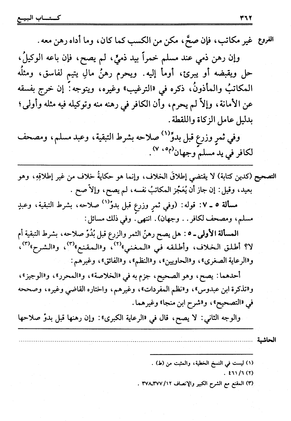 "مَسْأَلَةٌ 5 - 7" قَوْلُهُ: وَفِي ثَمَرٍ وَزَرْعٍ قَبْلَ بُدُوِّ1 صَلَاحِهِ بِشَرْطِ التَّبْقِيَةِ وَعَبْدٌ مُسْلِمٌ وَمُصْحَفٌ لِكَافِرٍ وَجْهَانِ, انْتَهَى, فِي ذَلِكَ مَسَائِلُ: