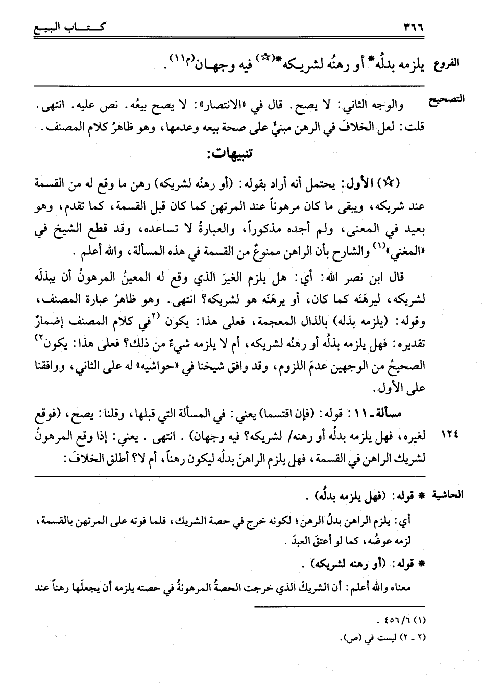 "*" الْأَوَّلُ: يَحْتَمِلُ أَنَّهُ أَرَادَ بِقَوْلِهِ "أَوْ رَهْنُهُ لِشَرِيكِهِ" رَهْنَ مَا وَقَعَ لَهُ مِنْ الْقِسْمَةِ عِنْدَ شَرِيكِهِ, وَيَبْقَى مَا كَانَ مَرْهُونًا عِنْدَ الْمُرْتَهِنِ كَمَا كَانَ قَبْلَ الْقِسْمَةِ, كَمَا تَقَدَّمَ, وَهُوَ بَعِيدٌ فِي الْمَعْنَى, وَلَمْ أَجِدْهُ مَذْكُورًا, وَالْعِبَارَةُ لَا تُسَاعِدُهُ, وَقَدْ قَطَعَ الشَّيْخُ فِي الْمُغْنِي1 وَالشَّارِحِ بِأَنَّ الرَّاهِنَ مَمْنُوعٌ مِنْ الْقِسْمَةِ فِي هَذِهِ الْمَسْأَلَةِ, وَاَللَّهُ أَعْلَمُ.