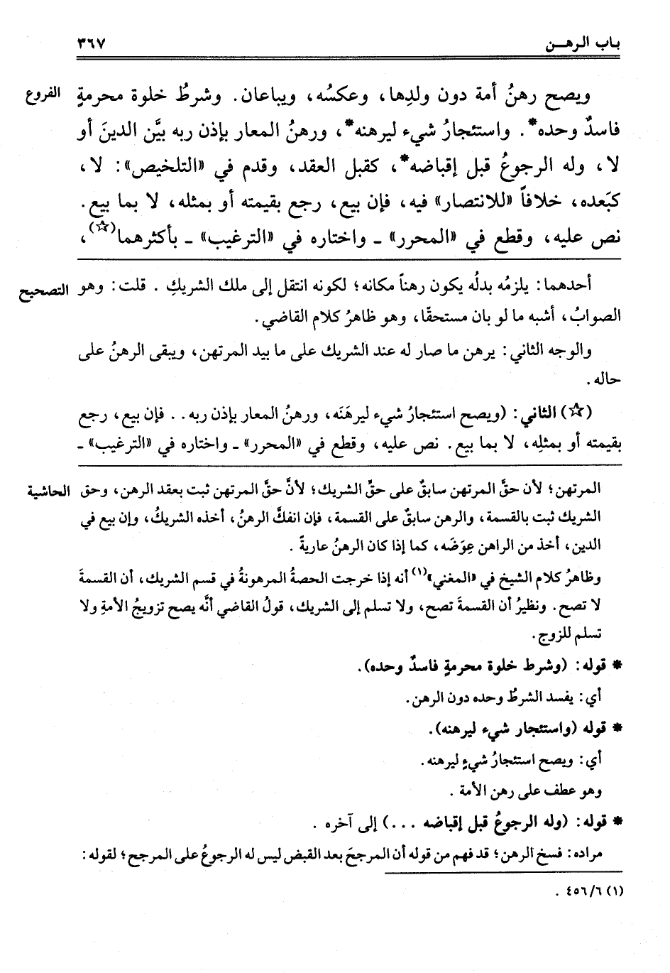 وَيَصِحُّ رَهْنُ أَمَةٍ دُونَ وَلَدِهَا, وَعَكْسُهُ, وَيُبَاعَانِ. وشرط خلوة محرمة فاسد وحده واستئجار شيء ليرهنه ورهن المعار بِإِذْنِ رَبِّهِ بَيَّنَ الدَّيْنَ أَوْ لَا, وَلَهُ الرَّجْوُ قَبْلَ إقْبَاضِهِ, كَقَبْلِ الْعَقْدِ, وَقَدَّمَ فِي التَّلْخِيصِ: لَا, كَبَعْدِهِ, خِلَافًا لِلِانْتِصَارِ فِيهِ, فَإِنْ بِيعَ رَجَعَ بِقِيمَتِهِ أَوْ بِمِثْلِهِ لَا بِمَا بِيعَ, نَصَّ عَلَيْهِ, وَقَطَعَ فِي الْمُحَرَّرِ وَاخْتَارَهُ في الترغيب بأكثرهما"*",