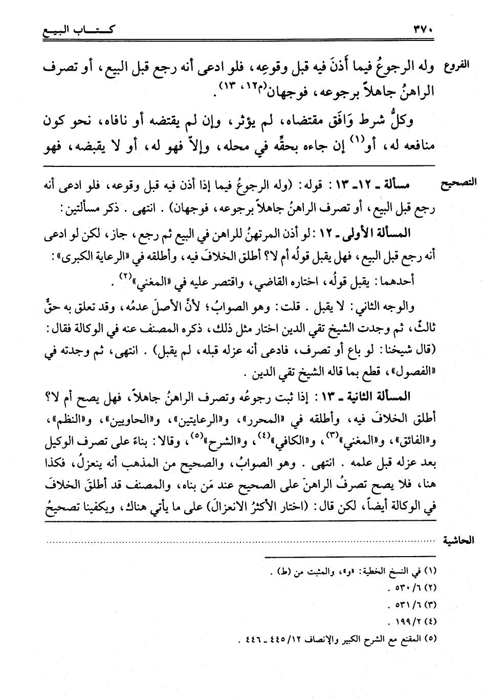 ـــــــــــــــــــــــــــــQ"مَسْأَلَةٌ 12" قَوْلُهُ: وَلَهُ الرُّجُوعُ فِيمَا إذَا أَذِنَ فِيهِ قَبْلَ وُقُوعِهِ, فَلَوْ ادَّعَى أَنَّهُ رَجَعَ قَبْلَ الْبَيْعِ أَوْ تَصَرَّفَ الرَّاهِنُ جَاهِلًا بِرُجُوعِهِ فَوَجْهَانِ, انْتَهَى. ذَكَرَ مَسْأَلَتَيْنِ: