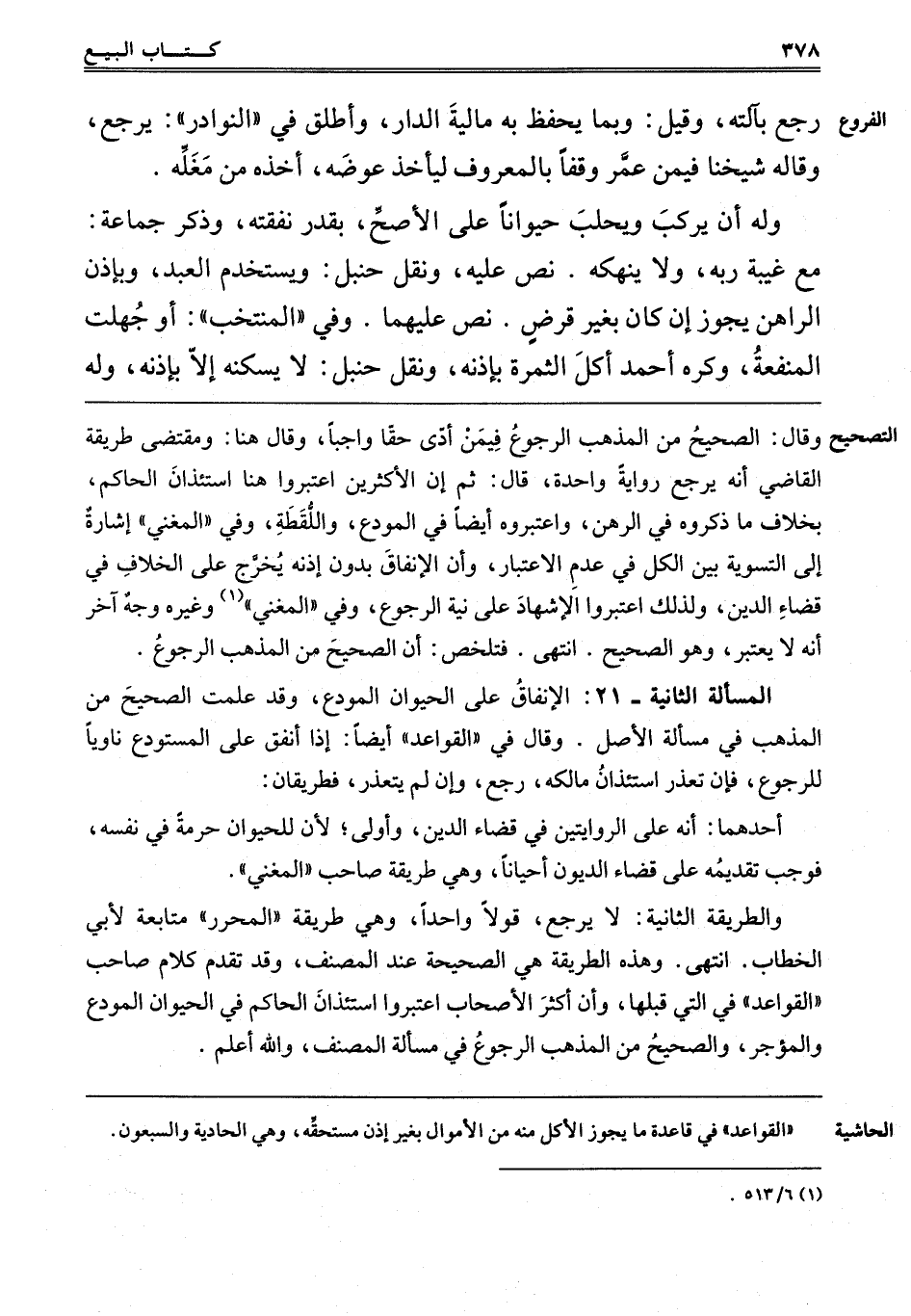 "وَالطَّرِيقَةُ الثَّانِيَةُ" لَا يَرْجِعُ, قَوْلًا وَاحِدًا, وَهِيَ طَرِيقَةُ الْمُحَرَّرِ مُتَابَعَةً لِأَبِي الْخَطَّابِ, انْتَهَى. وَهَذِهِ الطَّرِيقَةُ هِيَ الصَّحِيحَةُ عِنْدَ الْمُصَنِّفِ, وَقَدْ تَقَدَّمَ كَلَامُ صَاحِبِ الْقَوَاعِدِ فِي الَّتِي قَبْلَهَا, وَأَنَّ أَكْثَرَ الْأَصْحَابِ اعْتَبَرُوا اسْتِئْذَانَ الْحَاكِمِ فِي الْحَيَوَانِ الْمُودَعِ وَالْمُؤَجَّرِ, وَالصَّحِيحُ مِنْ الْمَذْهَبِ الرُّجُوعُ فِي مَسْأَلَةِ الْمُصَنِّفِ, والله أعلم.