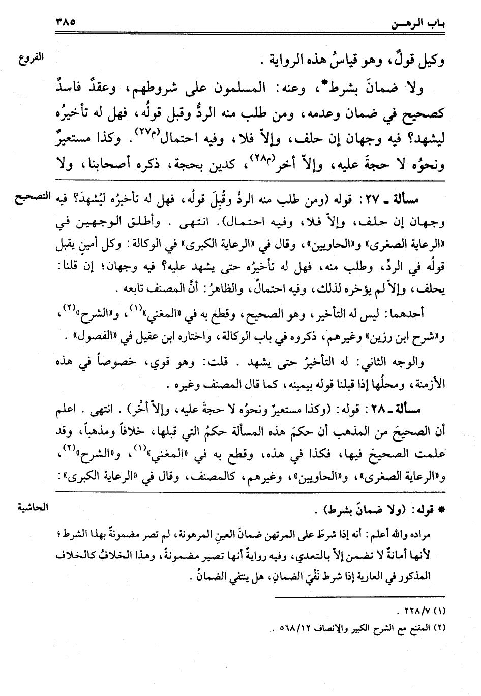"مَسْأَلَةٌ 28" قَوْلُهُ: وَكَذَا مُسْتَعِيرٌ وَنَحْوُهُ لَا حُجَّةَ عَلَيْهِ, وَإِلَّا أَخَّرَ, انْتَهَى. اعْلَمْ أَنَّ الصَّحِيحَ مِنْ الْمَذْهَبِ أَنَّ حُكْمَ هَذِهِ الْمَسْأَلَةِ حُكْمُ الَّتِي قَبْلَهَا, خِلَافًا وَمَذْهَبًا, وَقَدْ عَلِمْت الصَّحِيحَ فِيهَا, فَكَذَا فِي هَذِهِ, وَقَطَعَ بِهِ فِي الْمُغْنِي1 وَالشَّرْحِ2 وَالرِّعَايَةِ الصُّغْرَى وَالْحَاوِيَيْنِ وَغَيْرِهِمْ, كَالْمُصَنِّفِ. وَقَالَ فِي الرِّعَايَةِ الْكُبْرَى: