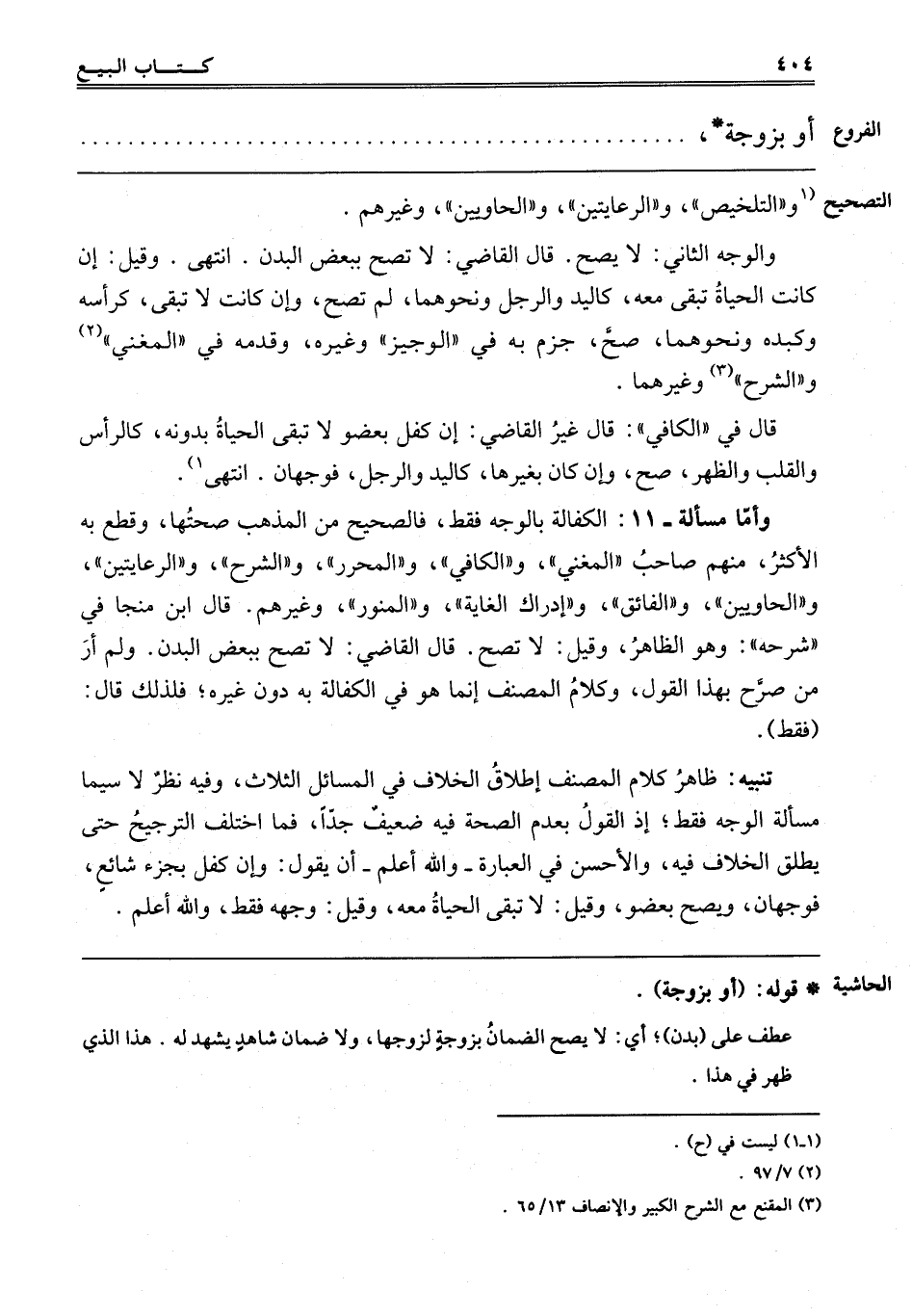 "وَأَمَّا مَسْأَلَةُ 11" الْكَفَالَةِ بِالْوَجْهِ فَقَطْ فَالصَّحِيحُ مِنْ الْمَذْهَبِ صِحَّتُهَا, وَقَطَعَ بِهِ الْأَكْثَرُ, مِنْهُمْ صَاحِبُ الْمُغْنِي وَالْكَافِي وَالْمُحَرَّرِ وَالشَّرْحِ وَالرِّعَايَتَيْنِ وَالْحَاوِيَيْنِ وَالْفَائِقِ وَإِدْرَاكِ الْغَايَةِ وَالْمُنَوِّرِ وَغَيْرُهُمْ. قَالَ ابْنُ مُنَجَّى فِي شَرْحِهِ: وَهُوَ الظَّاهِرُ. وَقِيلَ: لَا تَصِحُّ. قَالَ الْقَاضِي: لَا تَصِحُّ بِبَعْضِ الْبَدَنِ, وَلَمْ أَرَ مَنْ صَرَّحَ بِهَذَا الْقَوْلِ, وَكَلَامُ الْمُصَنِّفِ إنَّمَا هُوَ الْكَفَالَةُ بِهِ دُونَ غَيْرِهِ, فَلِذَلِكَ قَالَ: فَقَطْ.